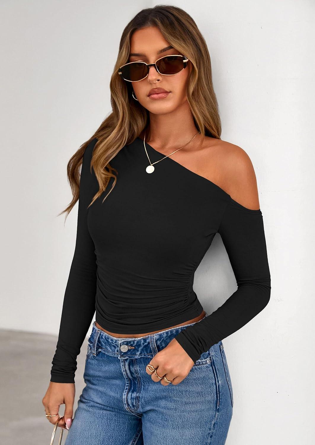 PRETTYGARDEN Womens Off Shoulder Long Sleeve Shirts 2025 Fall Ruched Fitted Asymmetrical Going Out Tops Trendy Y2K Clothes(Black)