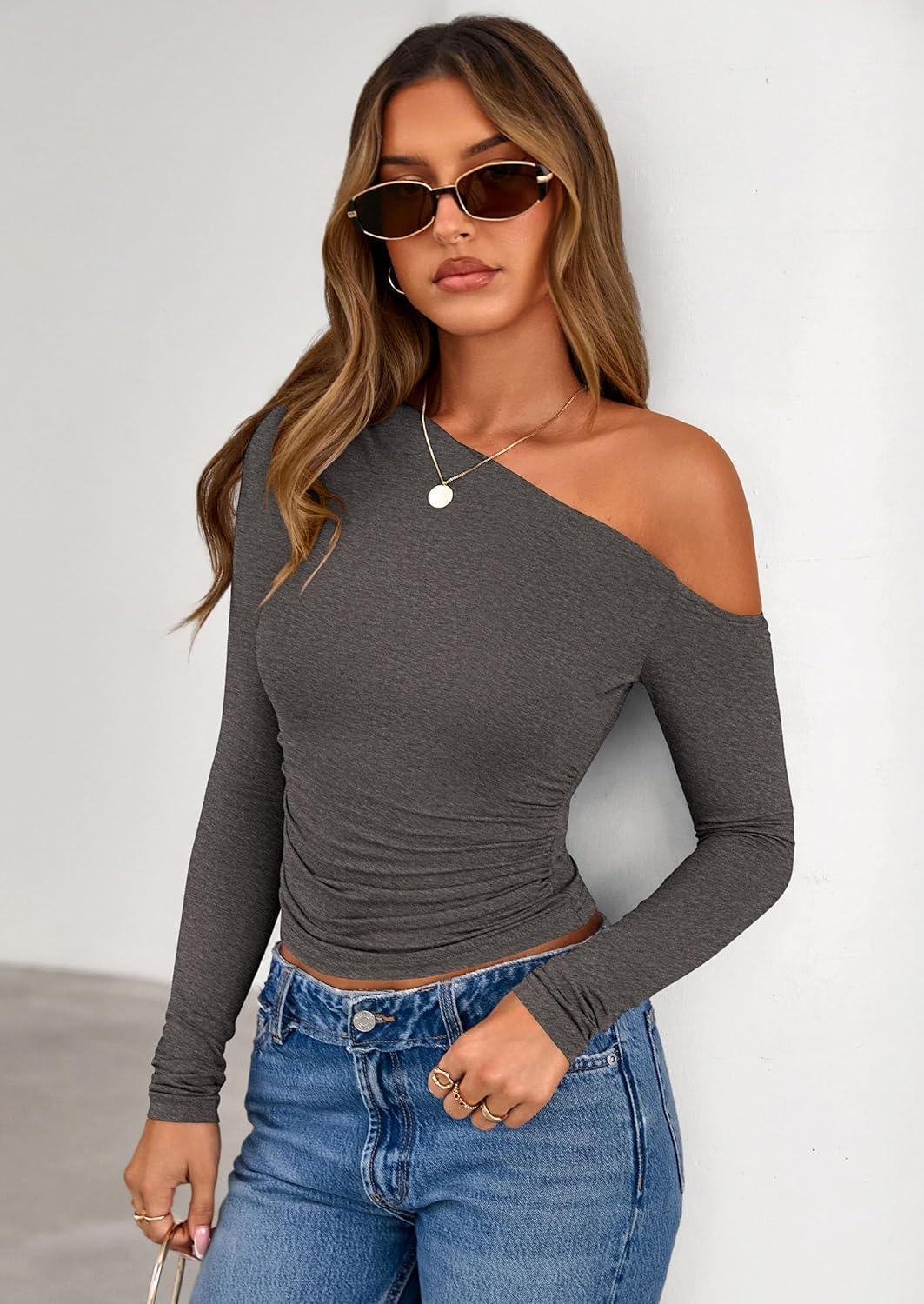 PRETTYGARDEN Womens Off Shoulder Long Sleeve Shirts 2025 Fall Ruched Fitted Asymmetrical Going Out Tops Trendy Y2K Clothes(Dark Grey)