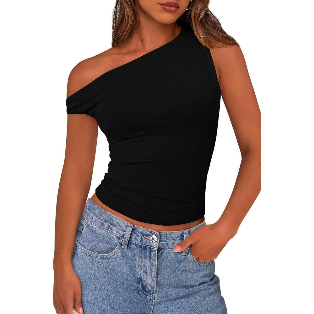 PRETTYGARDEN Womens Off Shoulder Tops 2025 Summer Trendy Casual Crop Top Cute Fitted Going Out Tshirts Shirts(Black)