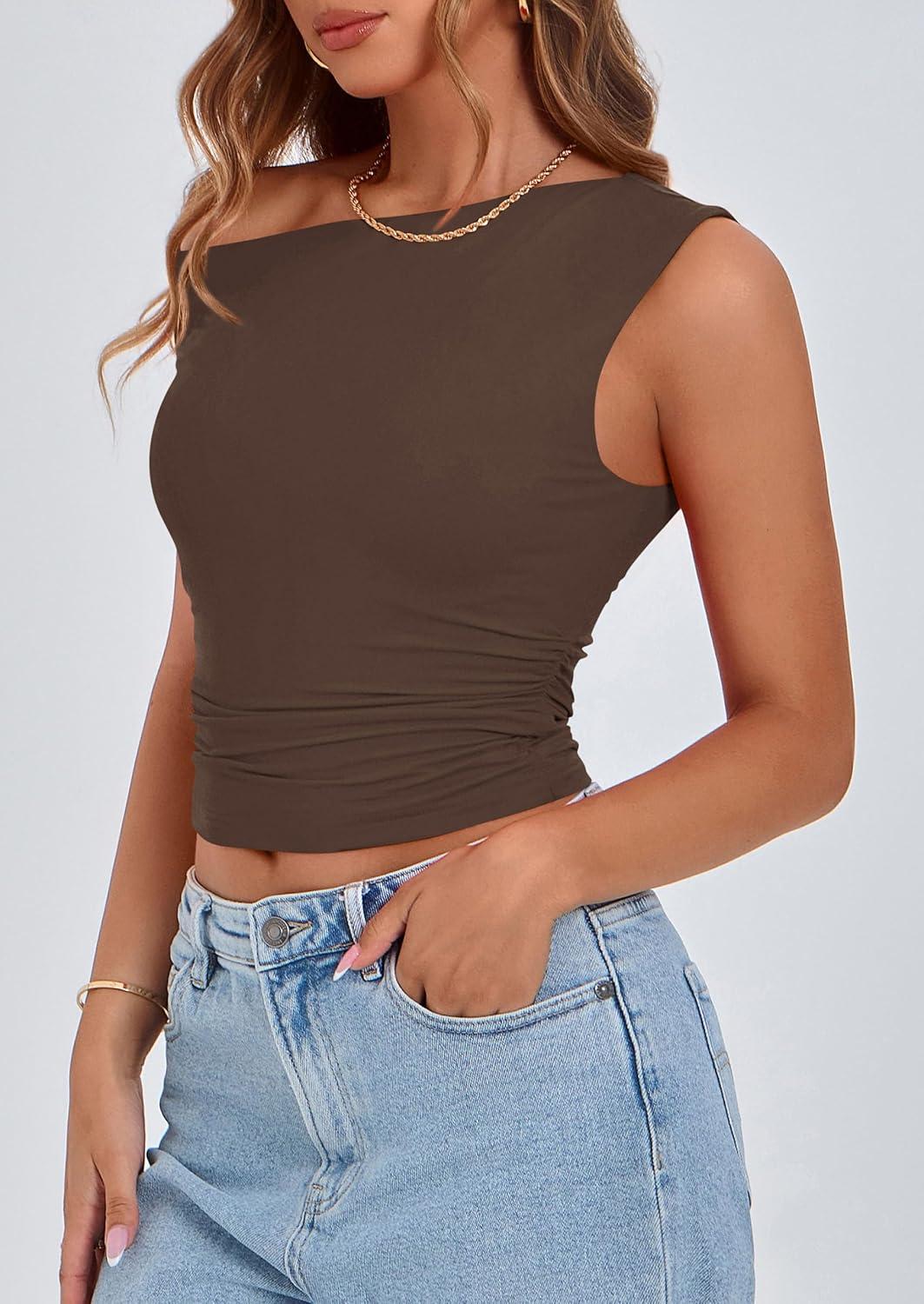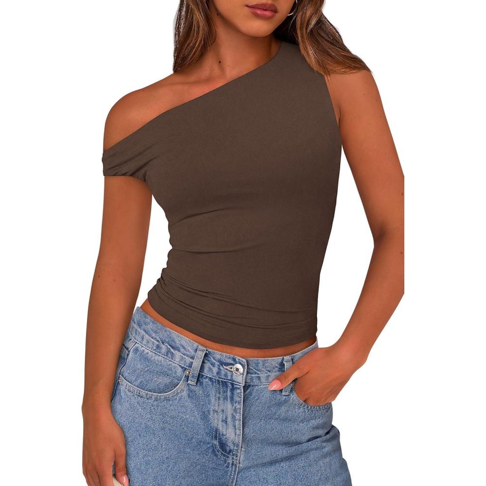 PRETTYGARDEN Womens Off Shoulder Tops 2025 Summer Trendy Casual Crop Top Cute Fitted Going Out Tshirts Shirts(Coffee)