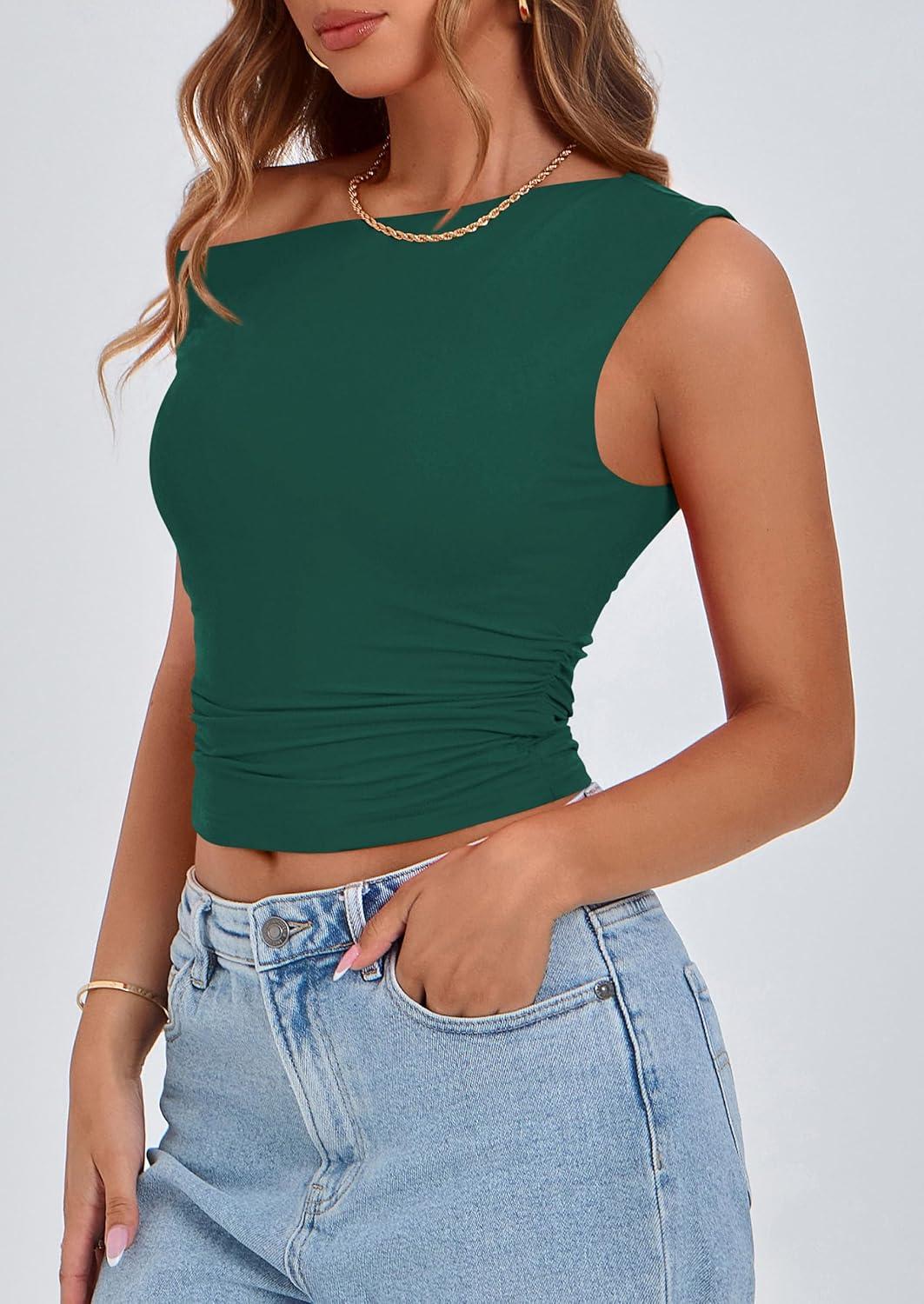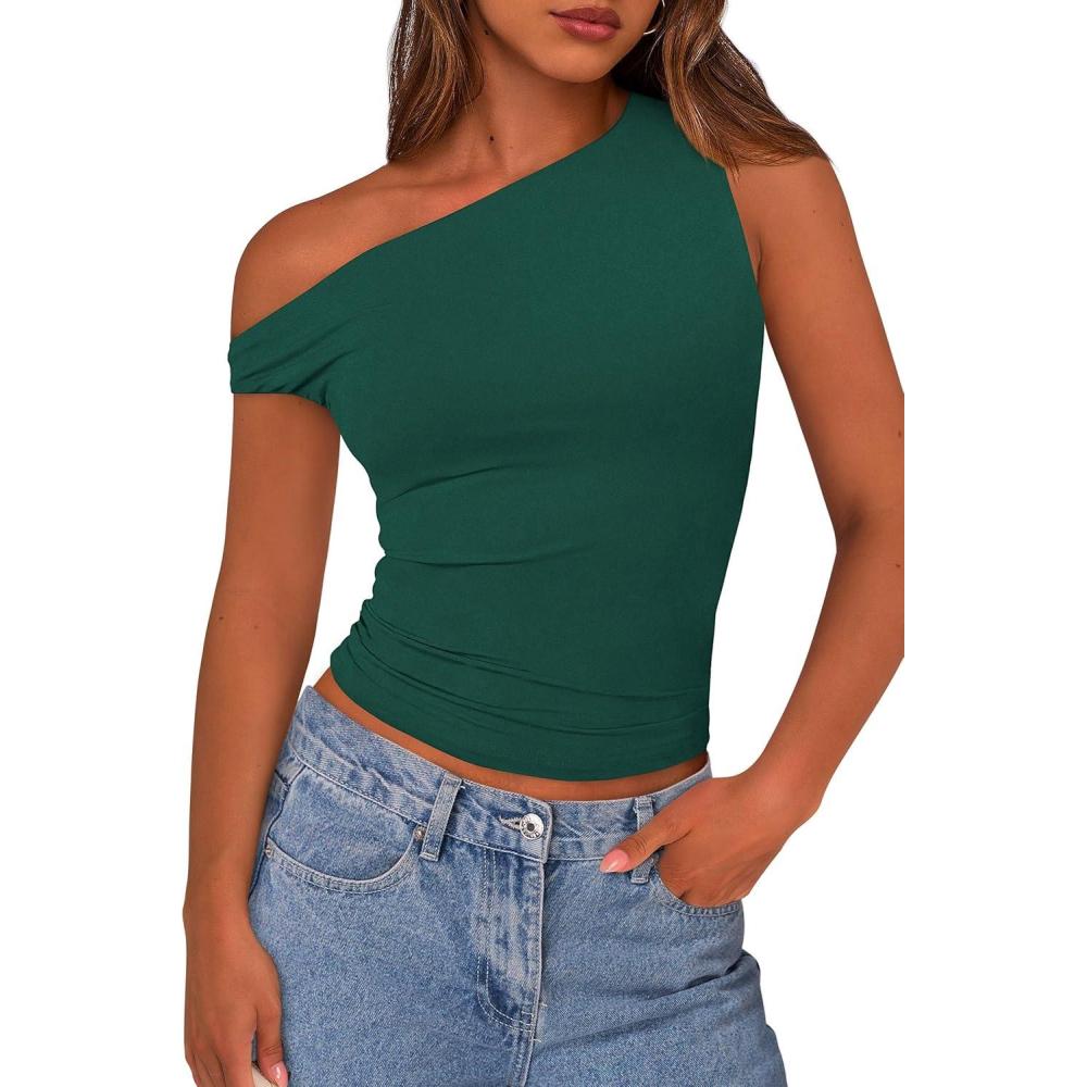 PRETTYGARDEN Womens Off Shoulder Tops 2025 Summer Trendy Casual Crop Top Cute Fitted Going Out Tshirts Shirts(Dark Green)