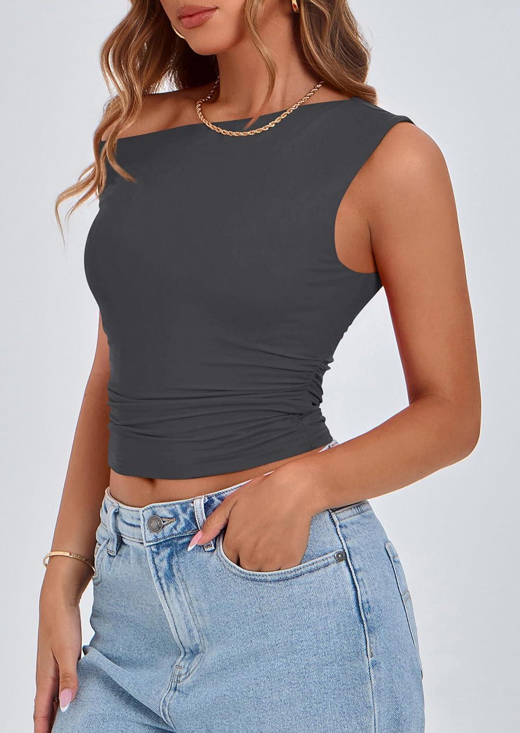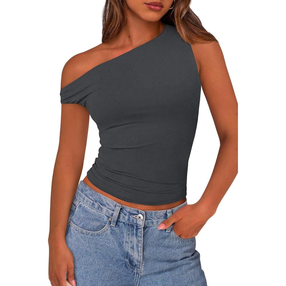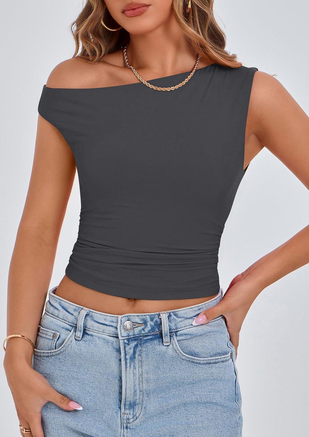 PRETTYGARDEN Womens Off Shoulder Tops 2025 Summer Trendy Casual Crop Top Cute Fitted Going Out Tshirts Shirts(Dark Grey)