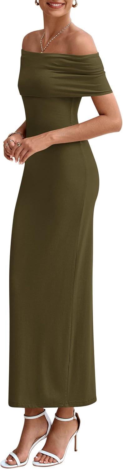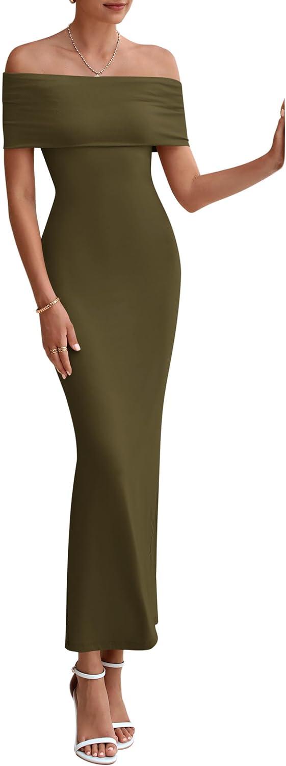 PRETTYGARDEN Women's Off The Shoulder Maxi Dresses 2025 Summer Formal Elegant Cocktail Party Wedding Guest Long Dress(Army Green)
