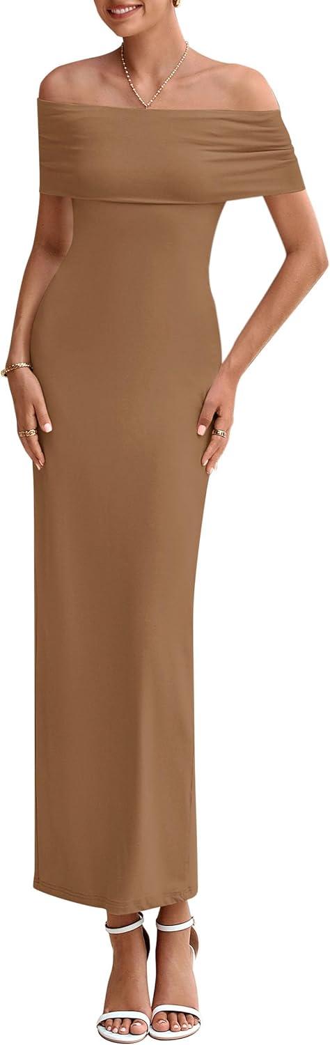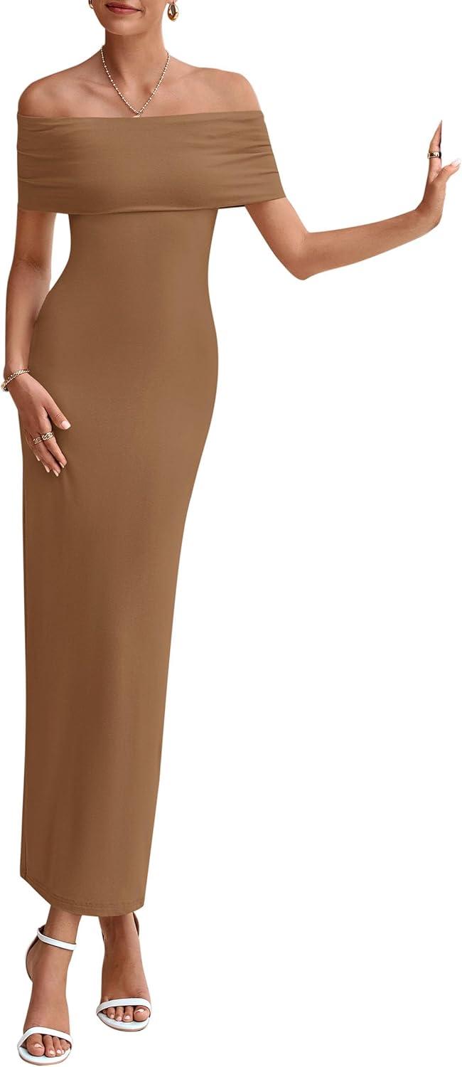 PRETTYGARDEN Women's Off The Shoulder Maxi Dresses 2025 Summer Formal Elegant Cocktail Party Wedding Guest Long Dress(Dark Khaki)