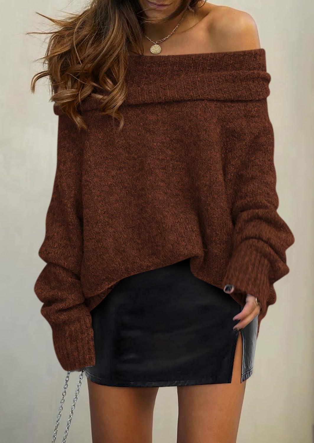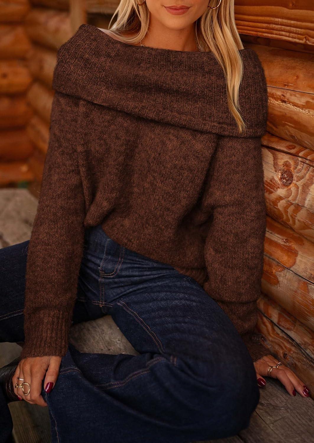 PRETTYGARDEN Women's Off The Shoulder Sweater Long Sleeve Tops 2025 Fall Loose Knit Pullover Sweaters Winter Clothes(Coffee)