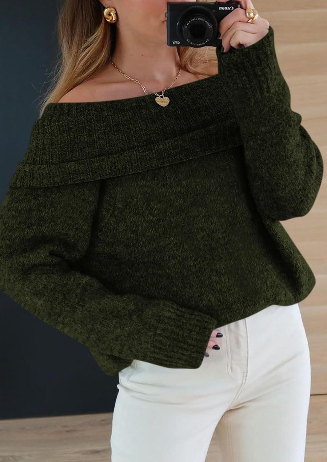 PRETTYGARDEN Women's Off The Shoulder Sweater Long Sleeve Tops 2025 Fall Loose Knit Pullover Sweaters Winter Clothes(Dark Army Green)