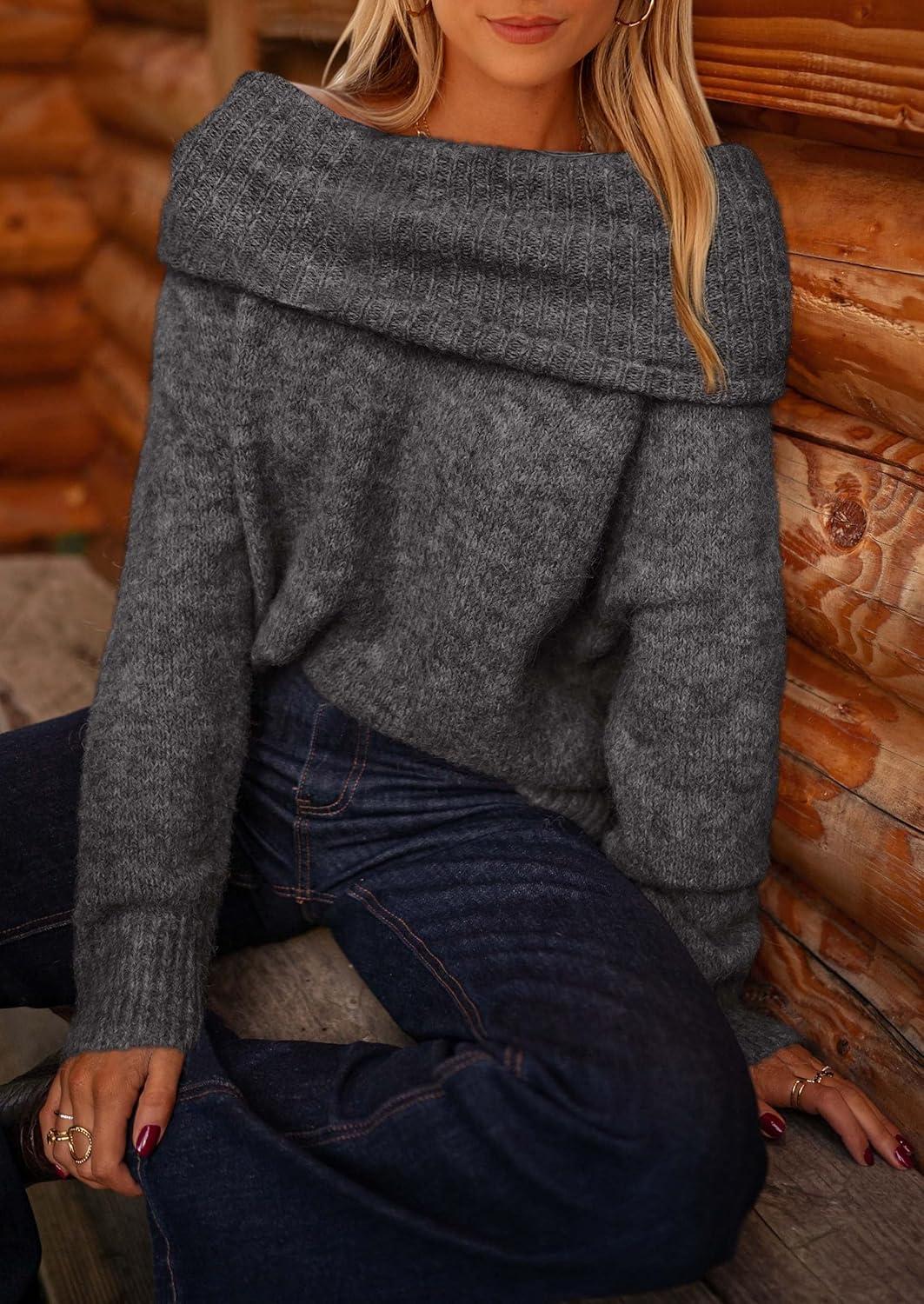 PRETTYGARDEN Women's Off The Shoulder Sweater Long Sleeve Tops 2025 Fall Loose Knit Pullover Sweaters Winter Clothes(Dark Grey)