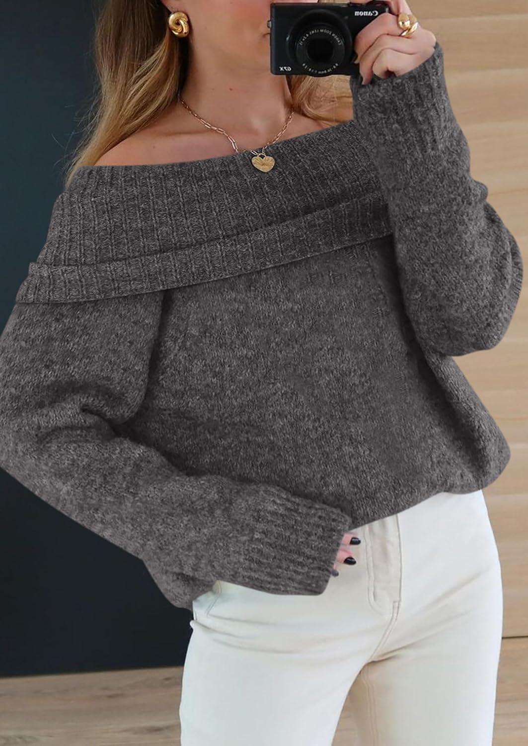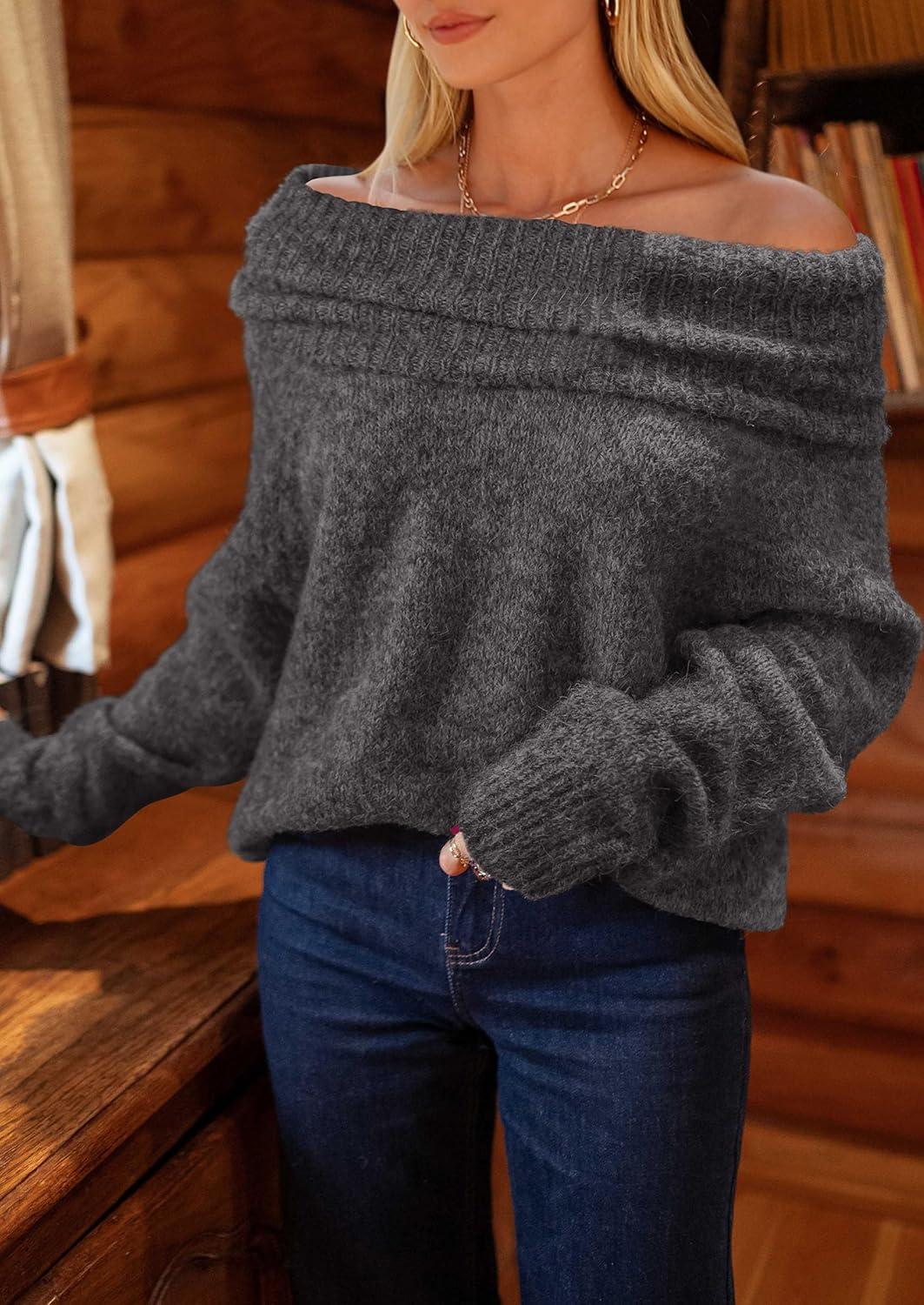 PRETTYGARDEN Women’s Off The Shoulder Sweater Long Sleeve Tops 2025 Fall Loose Knit Pullover Sweaters Winter Clothes(Dark Grey)