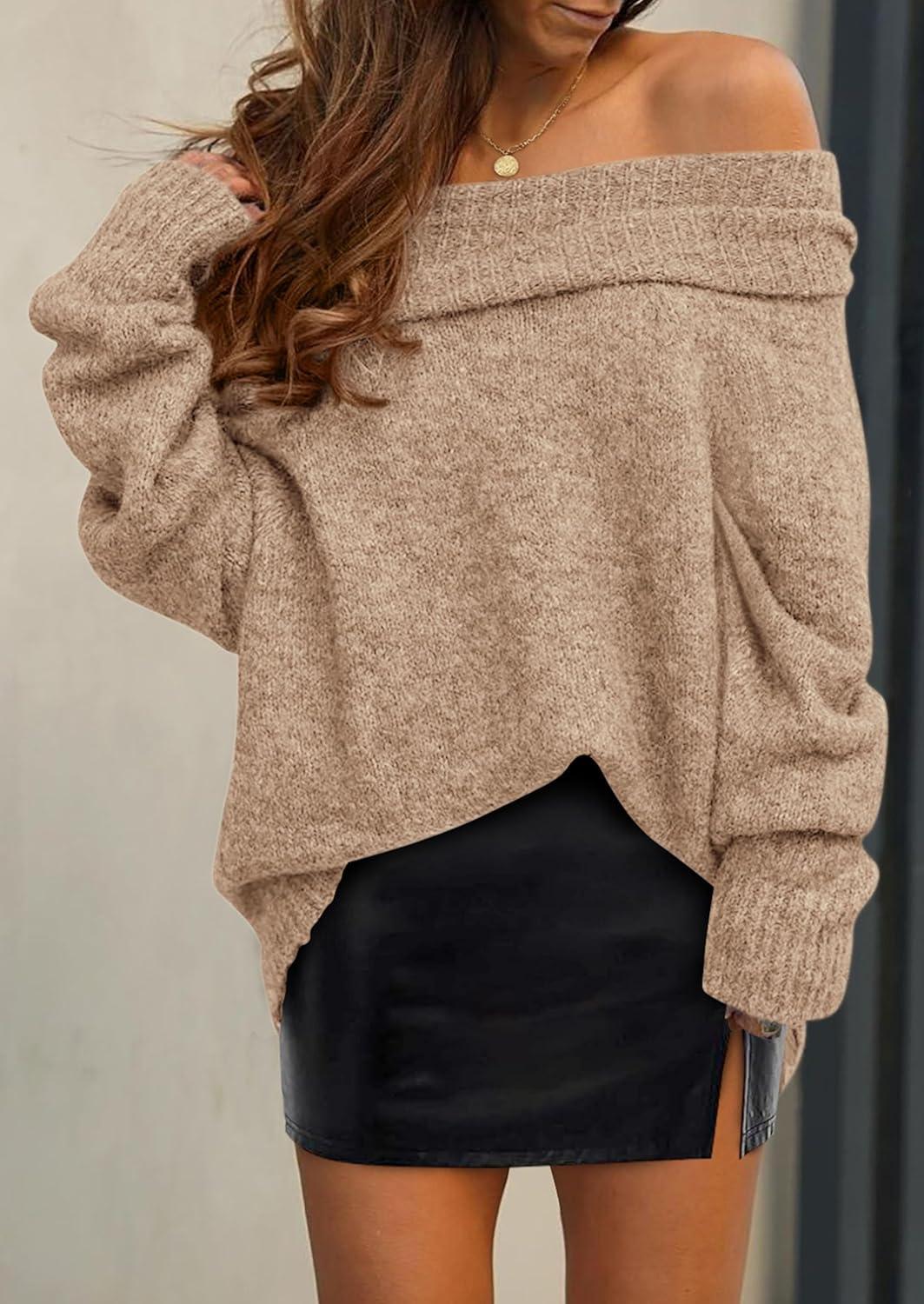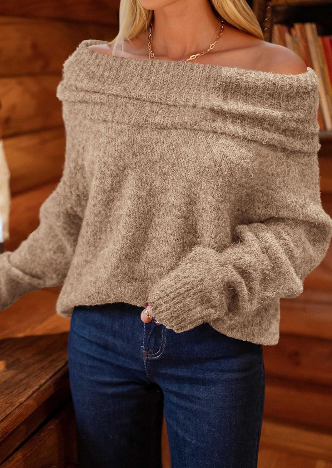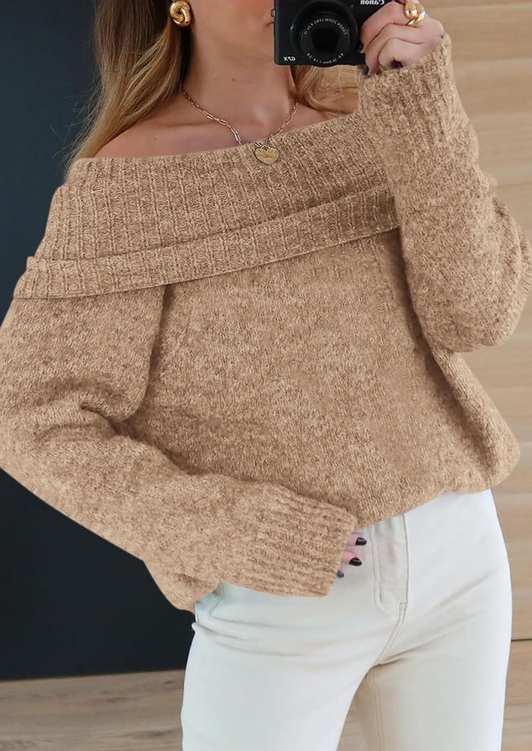 PRETTYGARDEN Women's Off The Shoulder Sweater Long Sleeve Tops 2025 Fall Loose Knit Pullover Sweaters Winter Clothes(Khaki)