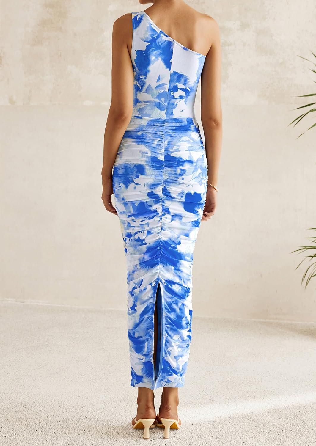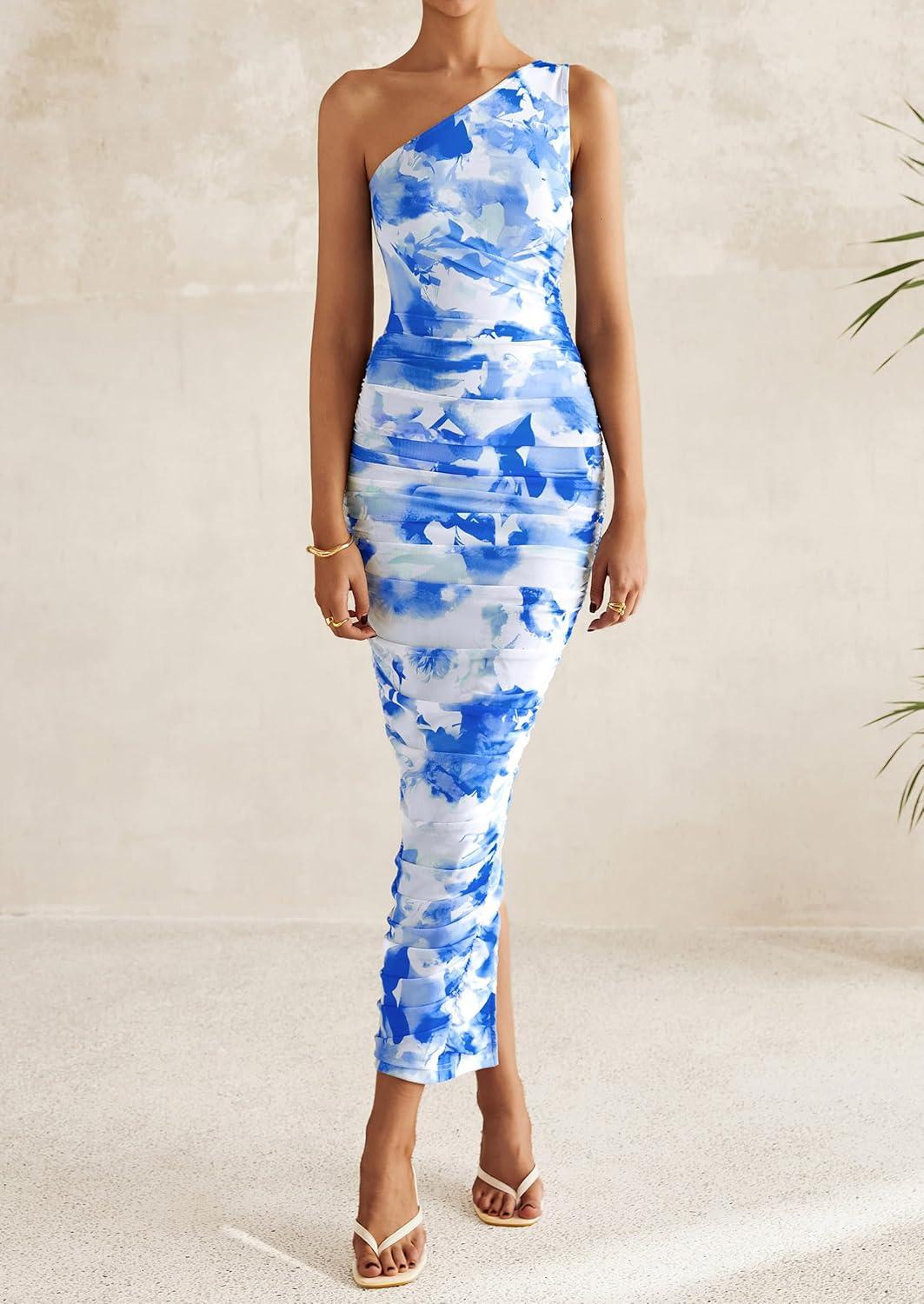 PRETTYGARDEN Women’s One Shoulder Bodycon Dresses Summer 2025 Ruched Floral Beach Cocktail Wedding Guest Dress(Blue)