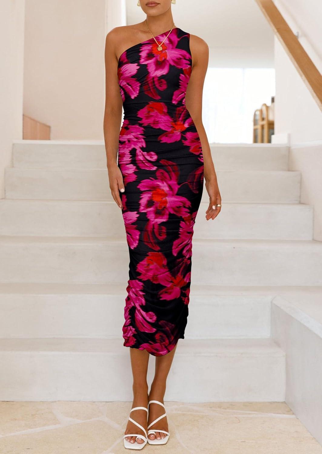 PRETTYGARDEN Women’s One Shoulder Bodycon Dresses Summer 2025 Ruched Floral Beach Cocktail Wedding Guest Dress(Floral Black Rose Red)