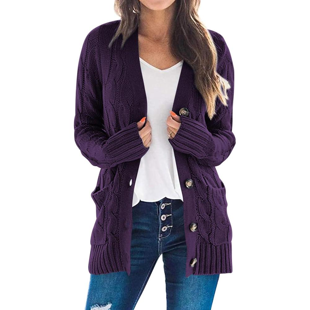 PRETTYGARDEN Women’s Open Front Cardigan Sweaters Fall Fashion Button Down Cable Knit Chunky Winter Clothing Outerwear Coats(Dark Purple)