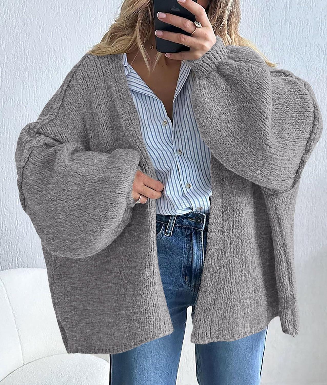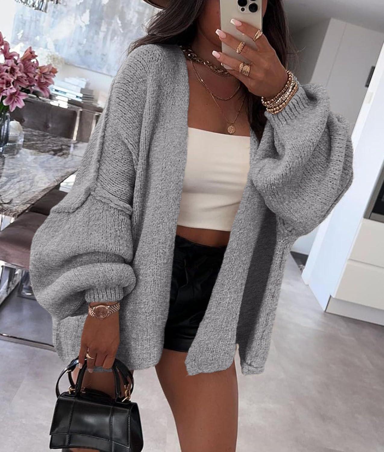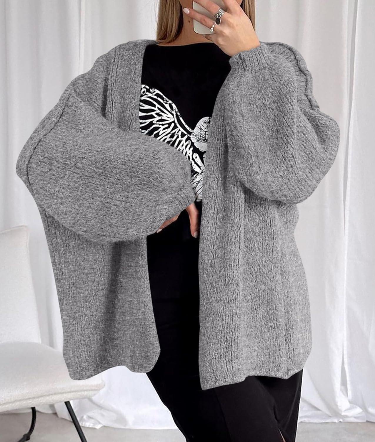 PRETTYGARDEN Womens Oversized Cardigan Sweaters 2025 Fall Long Lantern Sleeve Knit Open Front Lightweight Sweater(Grey)