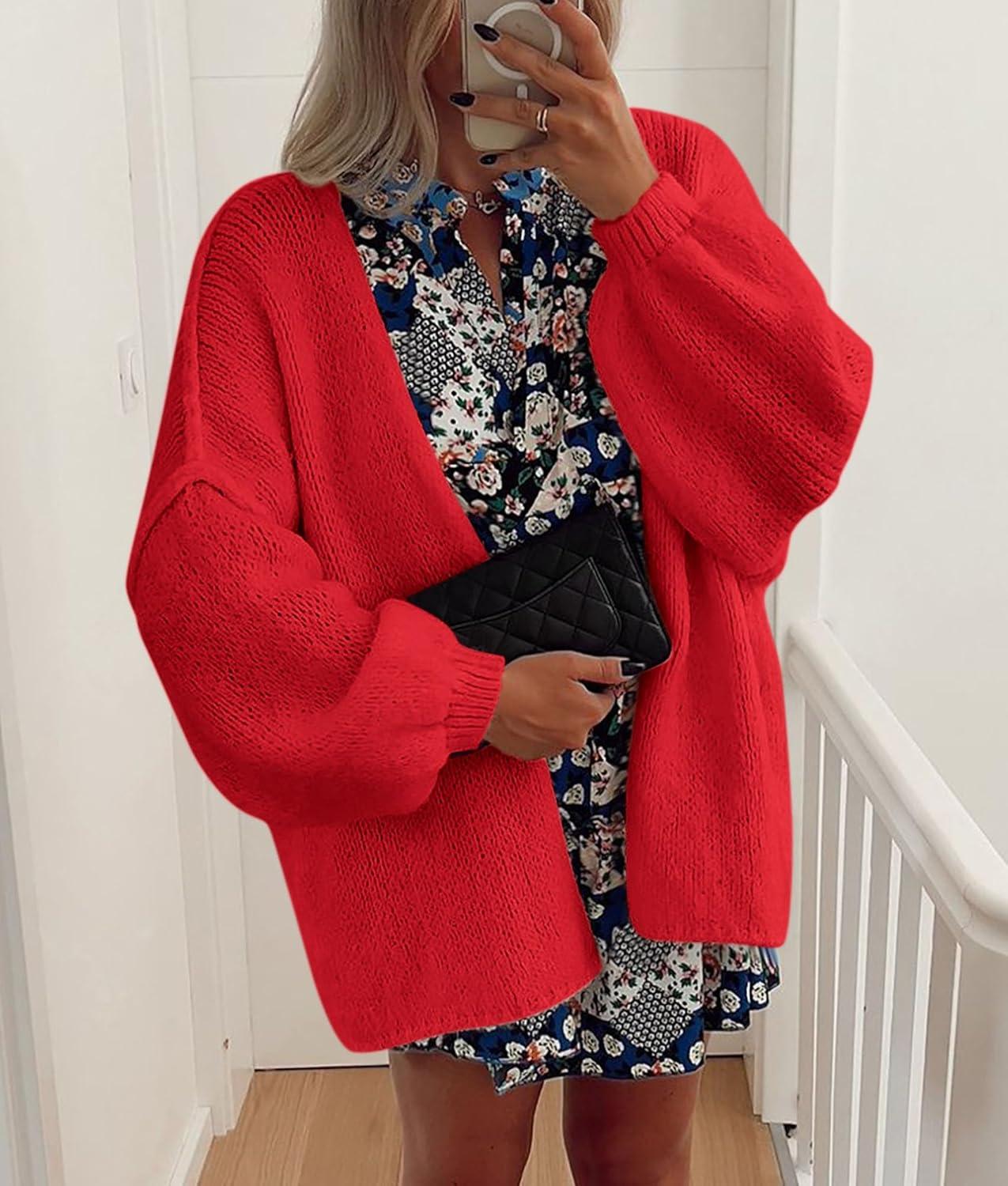 PRETTYGARDEN Womens Oversized Cardigan Sweaters 2025 Fall Long Lantern Sleeve Knit Open Front Lightweight Sweater(Red)