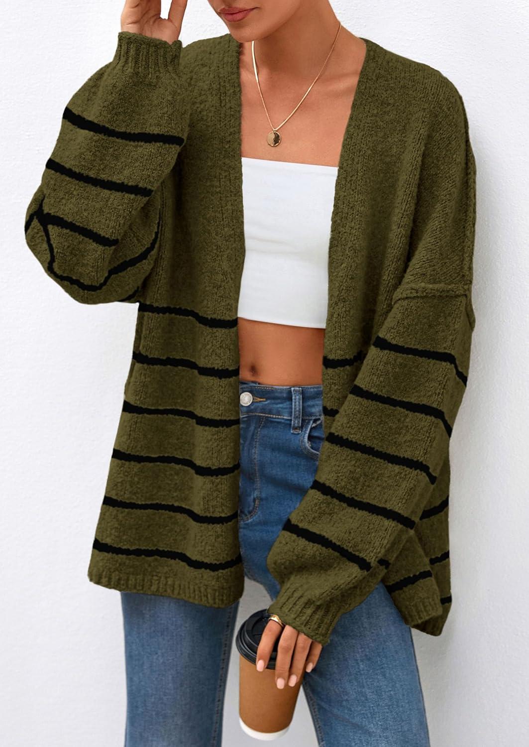 PRETTYGARDEN Womens Oversized Cardigan Sweaters 2025 Fall Long Lantern Sleeve Knit Open Front Lightweight Sweater(Striped Army Green)