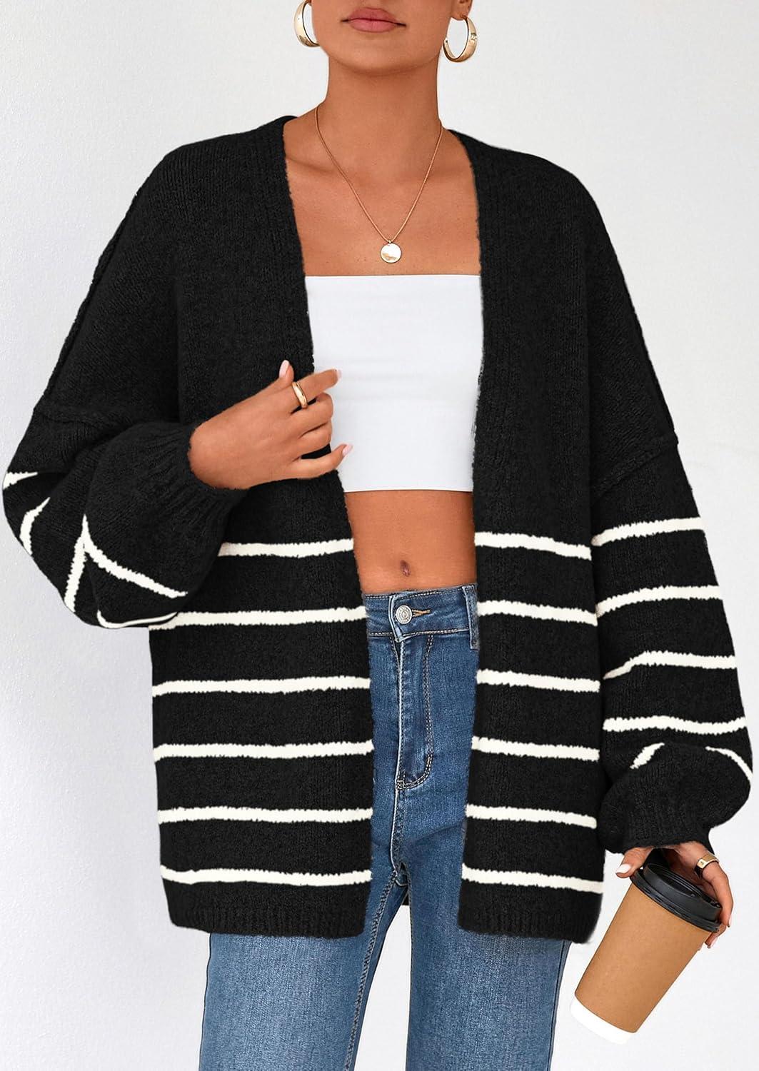PRETTYGARDEN Womens Oversized Cardigan Sweaters 2025 Fall Long Lantern Sleeve Knit Open Front Lightweight Sweater(Striped Black White)