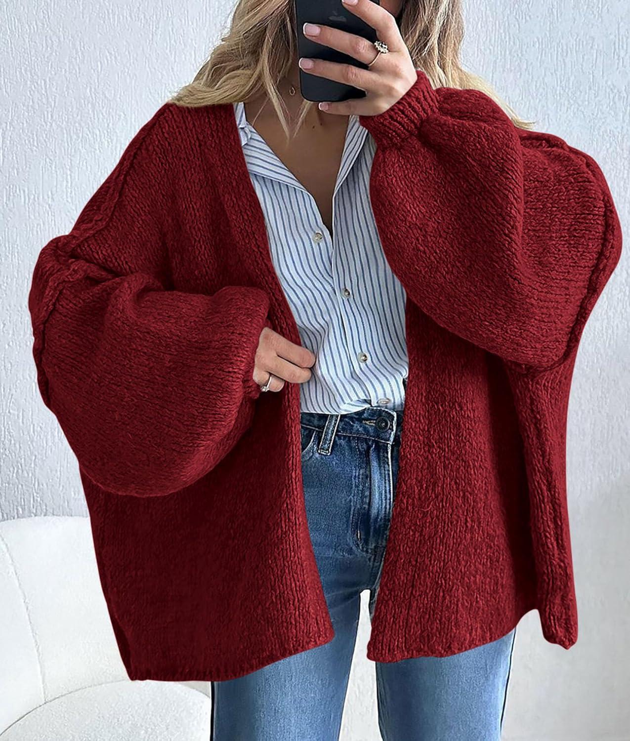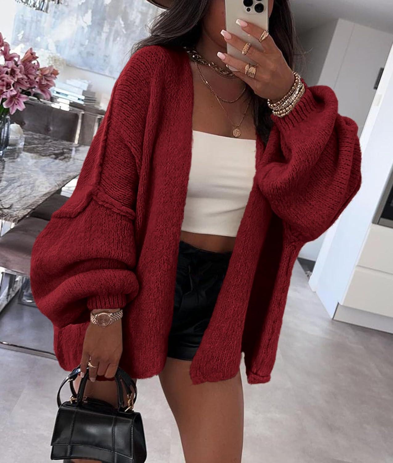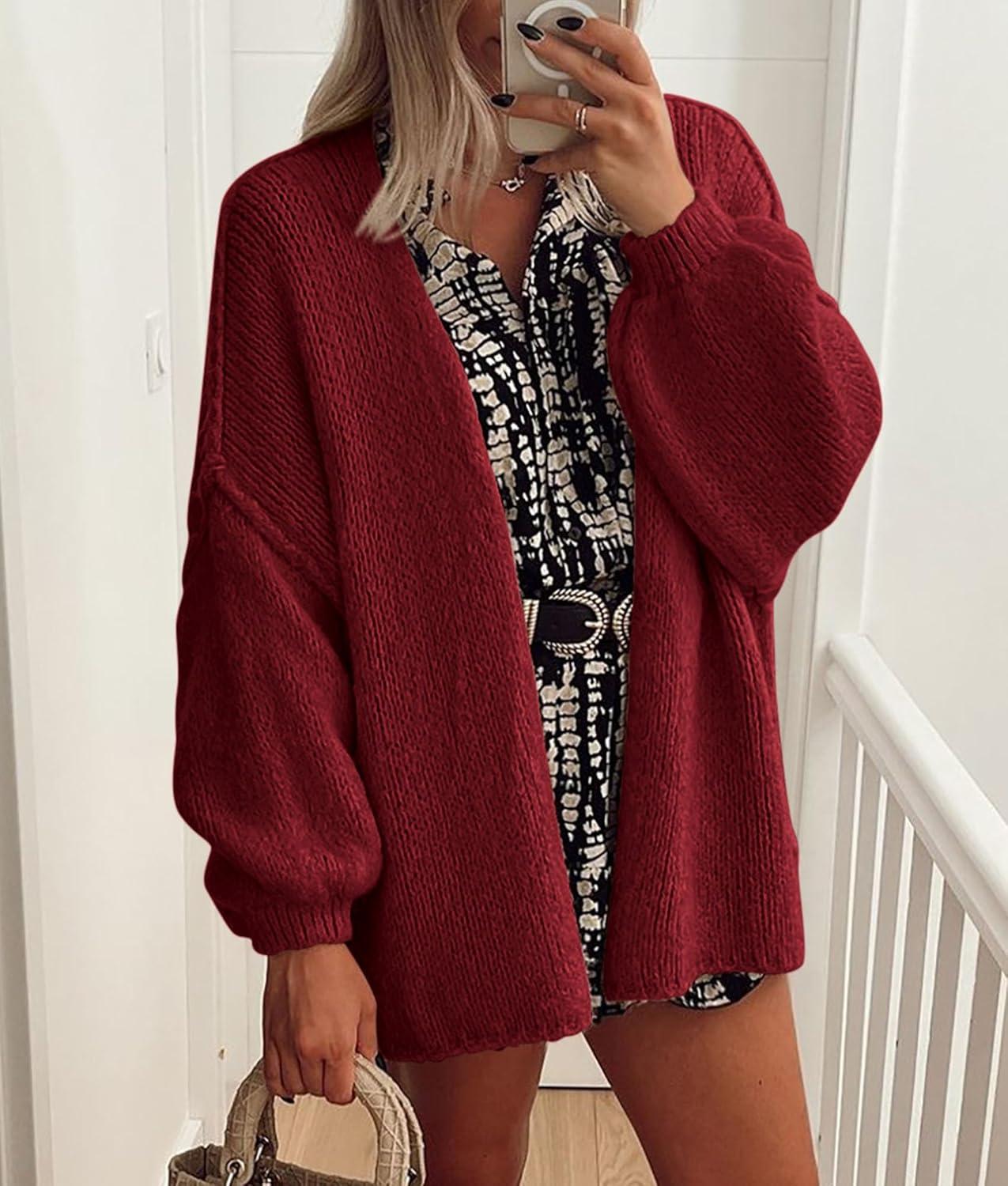 PRETTYGARDEN Womens Oversized Cardigan Sweaters 2025 Fall Long Lantern Sleeve Knit Open Front Lightweight Sweater(Wine Red)