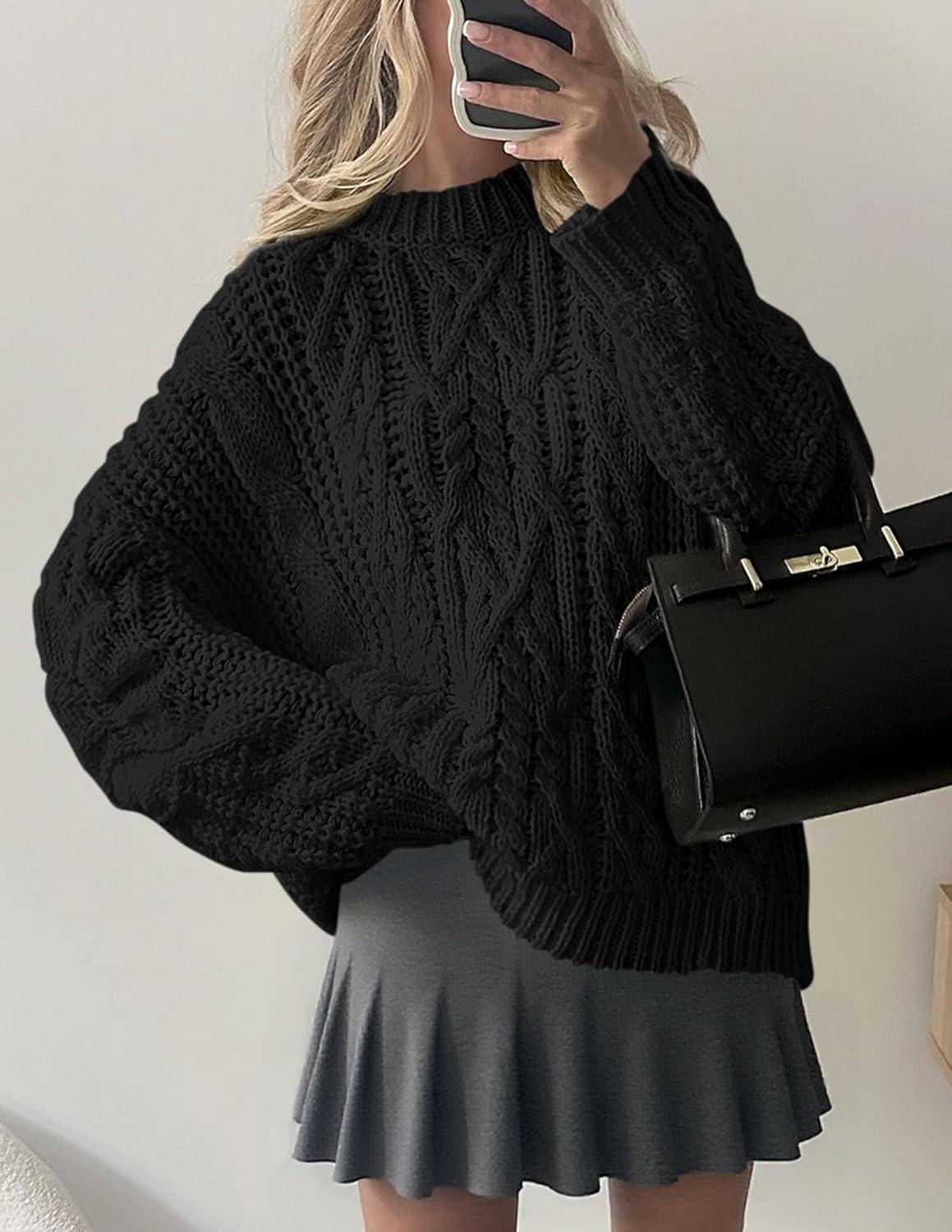 PRETTYGARDEN Women’s Oversized Fall Sweaters 2025 Casual Long Sleeve Crewneck Chunky Cable Knit Pullover Tops Winter Clothes(Black)