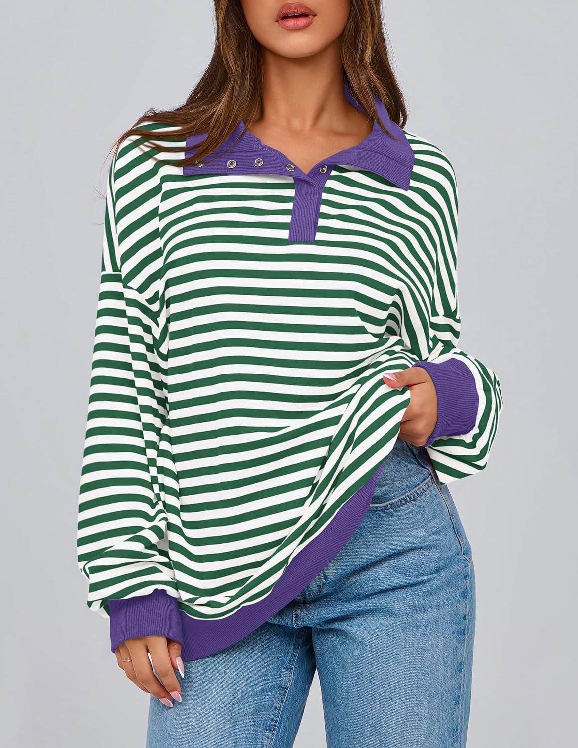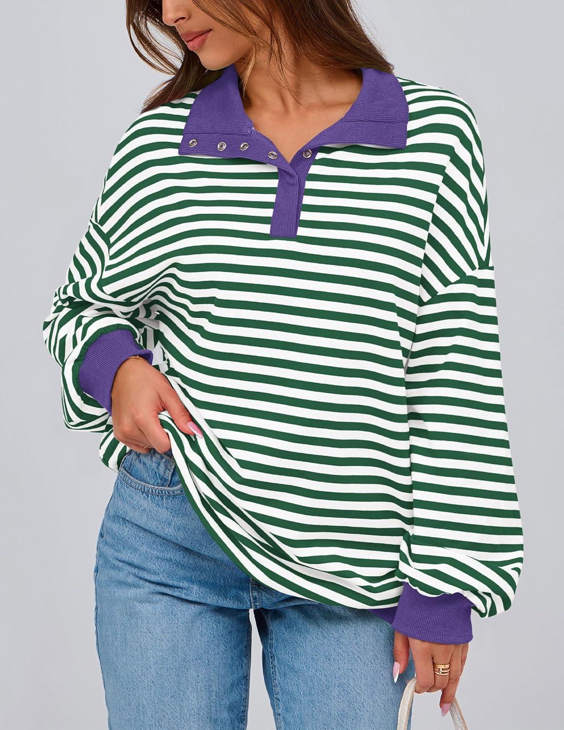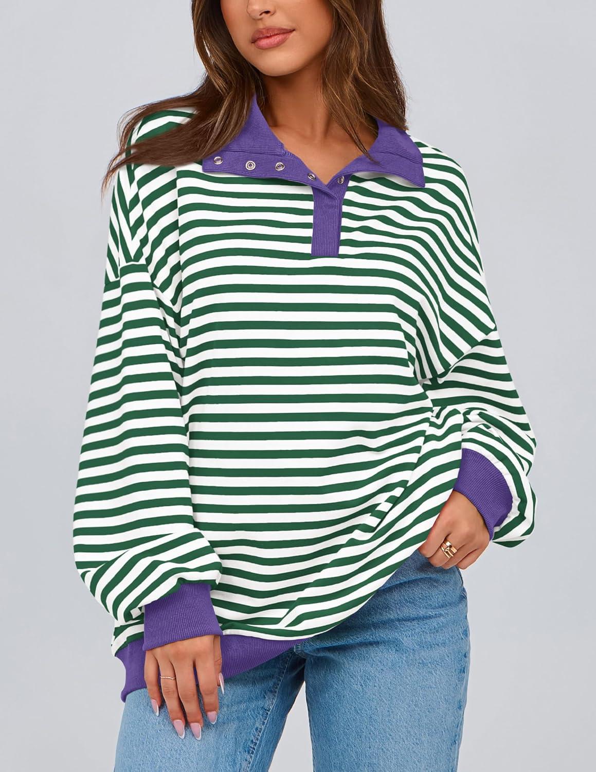 PRETTYGARDEN Women’s Oversized Striped Sweatshirts Spring Fall Trendy Casual Long Sleeve Button Up Tops Shirt Preppy Clothes(Striped Green White)