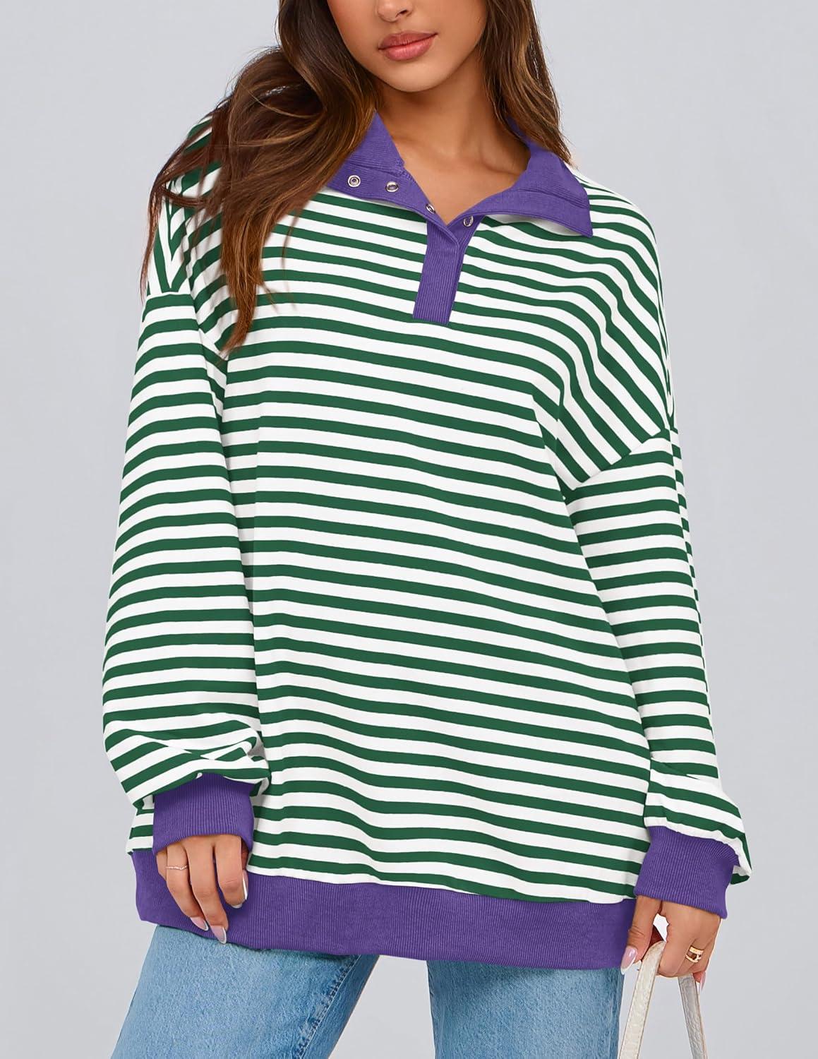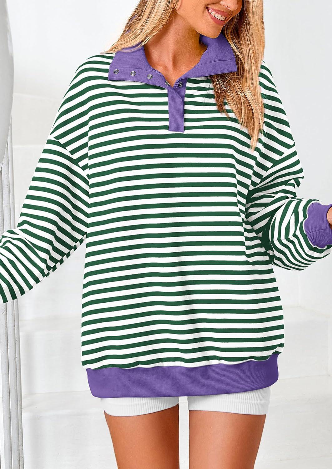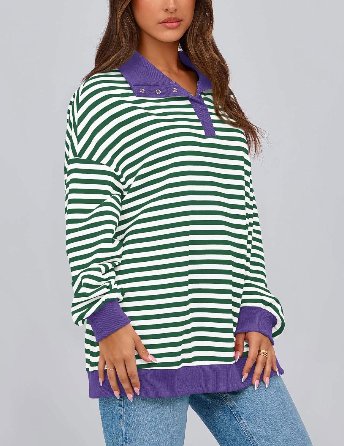 PRETTYGARDEN Women’s Oversized Striped Sweatshirts Spring Fall Trendy Casual Long Sleeve Button Up Tops Shirt Preppy Clothes(Striped Green White)