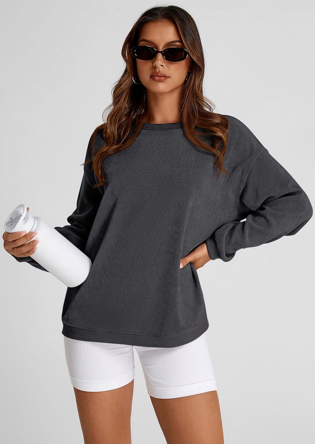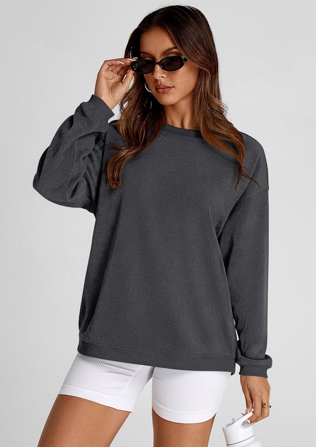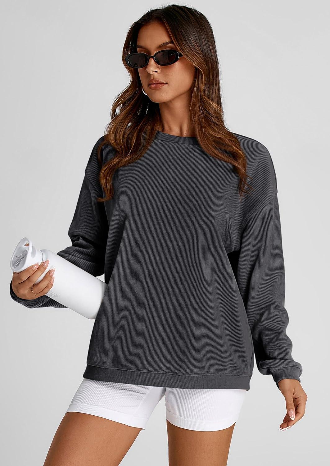 PRETTYGARDEN Women's Oversized Sweatshirt 2025 Fall Fashion Clothes Ribbed Corduroy Long Sleeve Going Out Pullover Tops(Dark Grey)