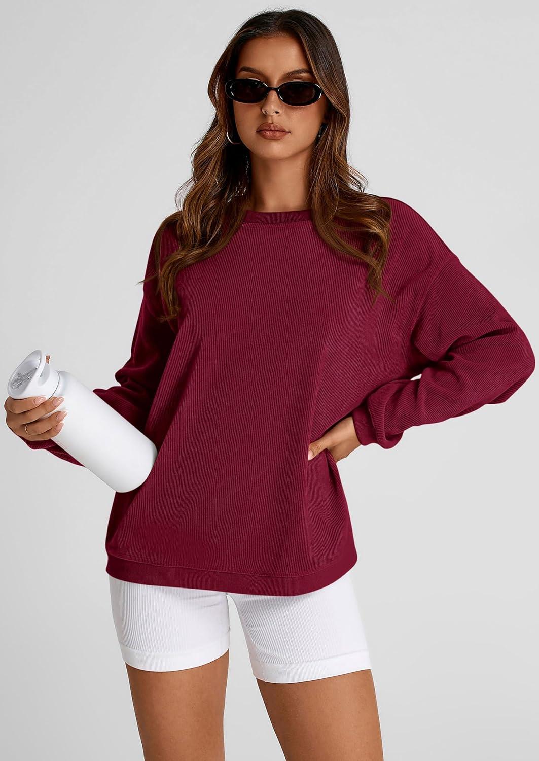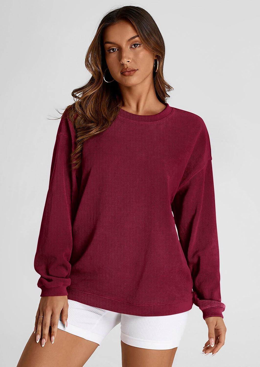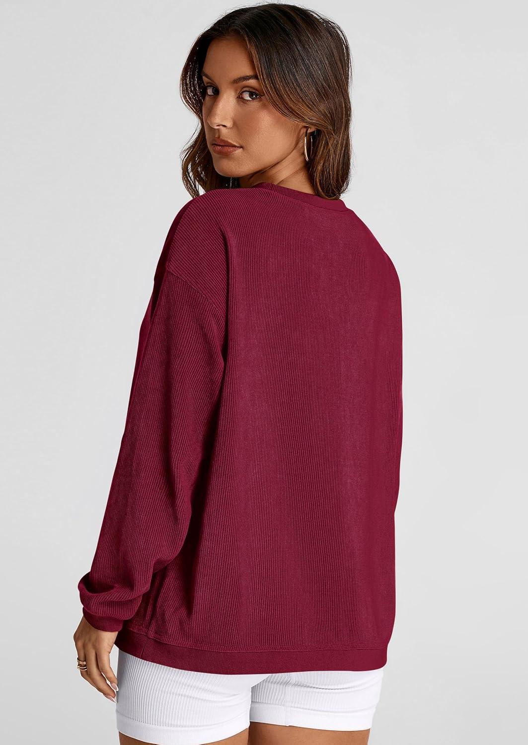 PRETTYGARDEN Women’s Oversized Sweatshirt 2025 Fall Fashion Clothes Ribbed Corduroy Long Sleeve Going Out Pullover Tops(Wine Red)