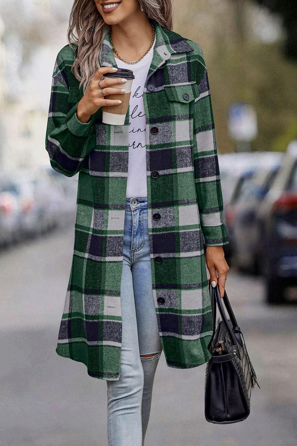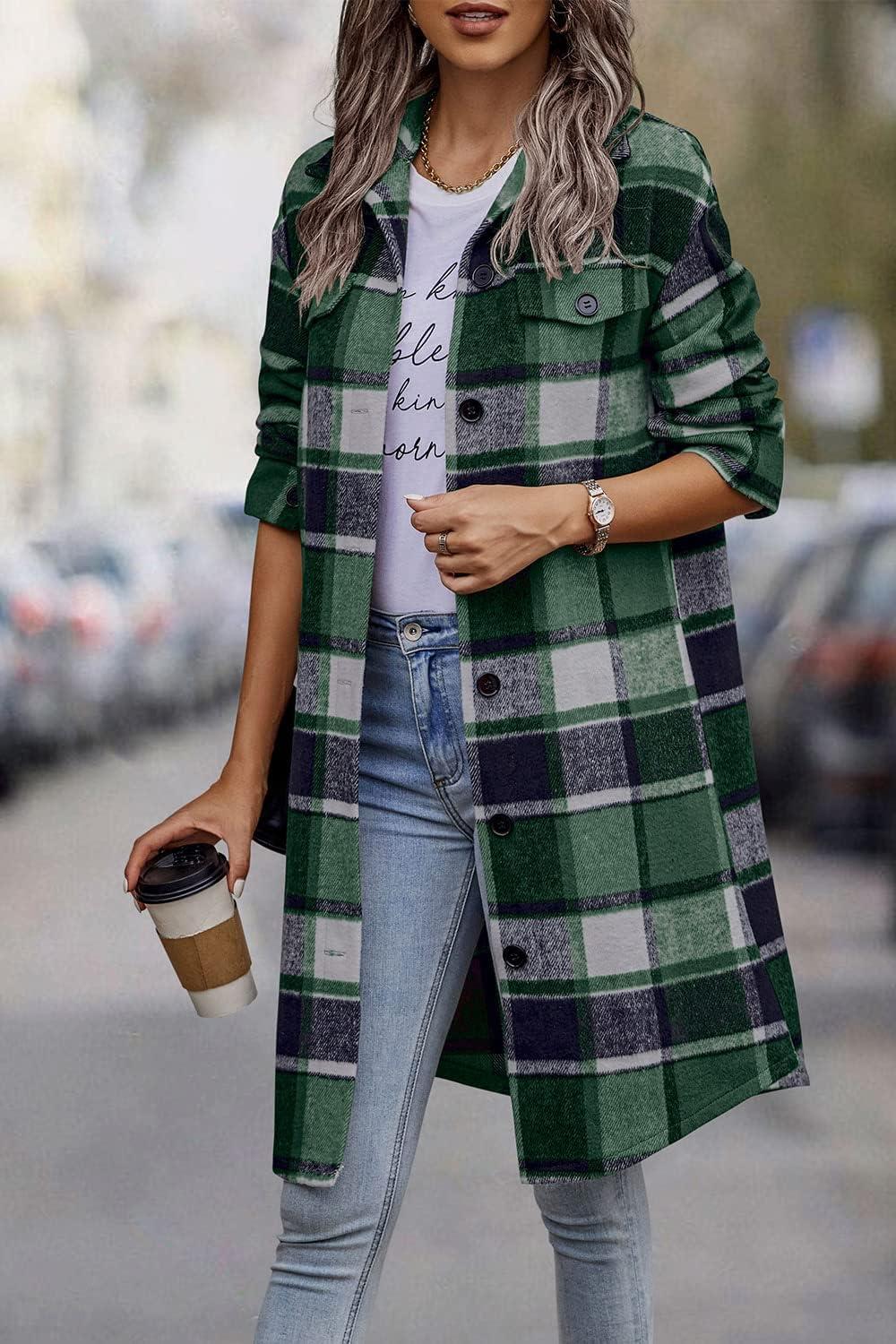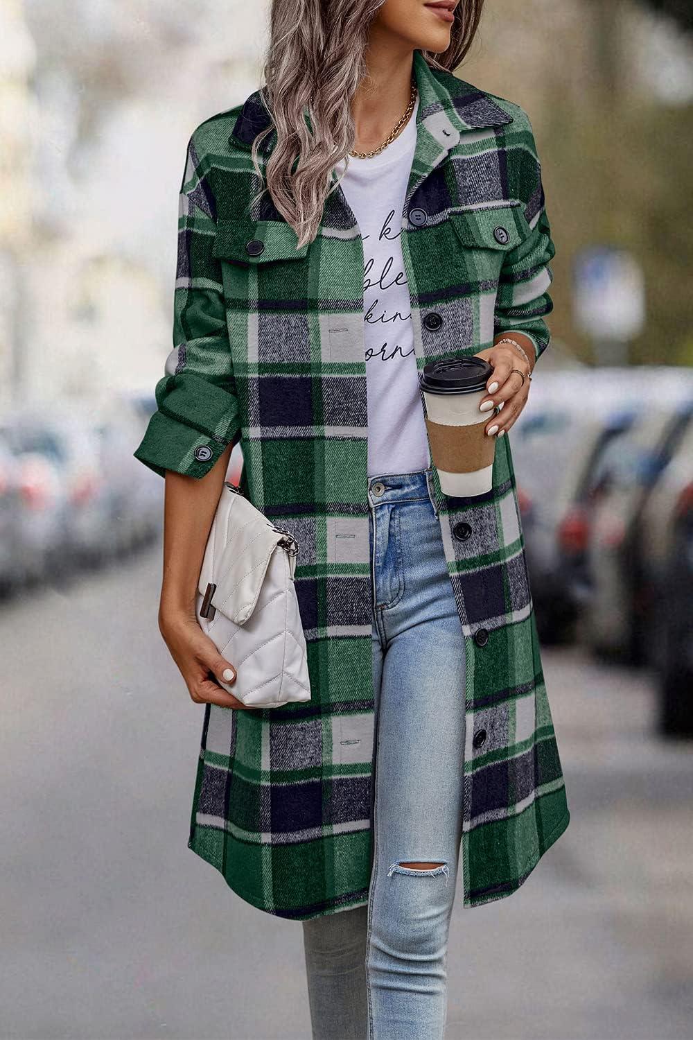 PRETTYGARDEN Womens Plaid Shacket Jacket Fall Fashion 2025 Long Sleeve Button Up Flannel Shirt Winter Clothing Woolen Coats(Green)