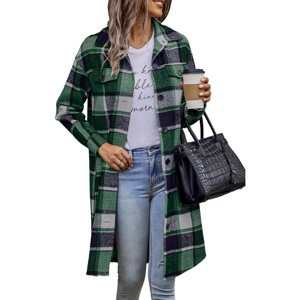 PRETTYGARDEN Womens Plaid Shacket Jacket Fall Fashion 2025 Long Sleeve Button Up Flannel Shirt Winter Clothing Woolen Coats(Dark Green)