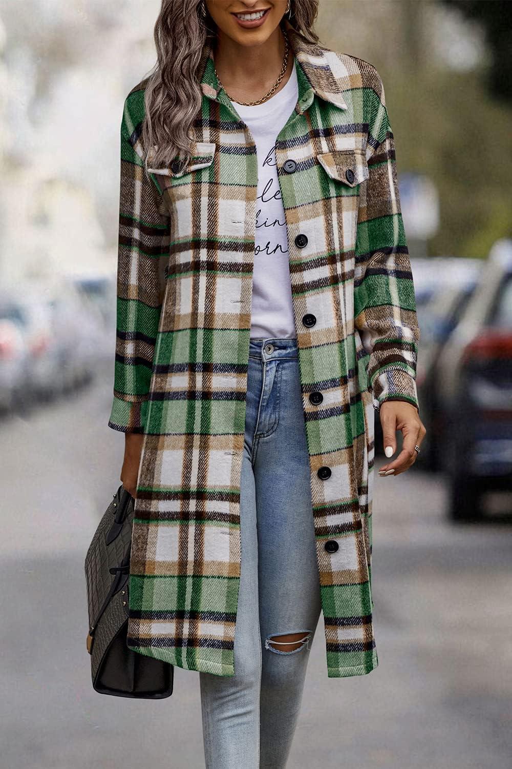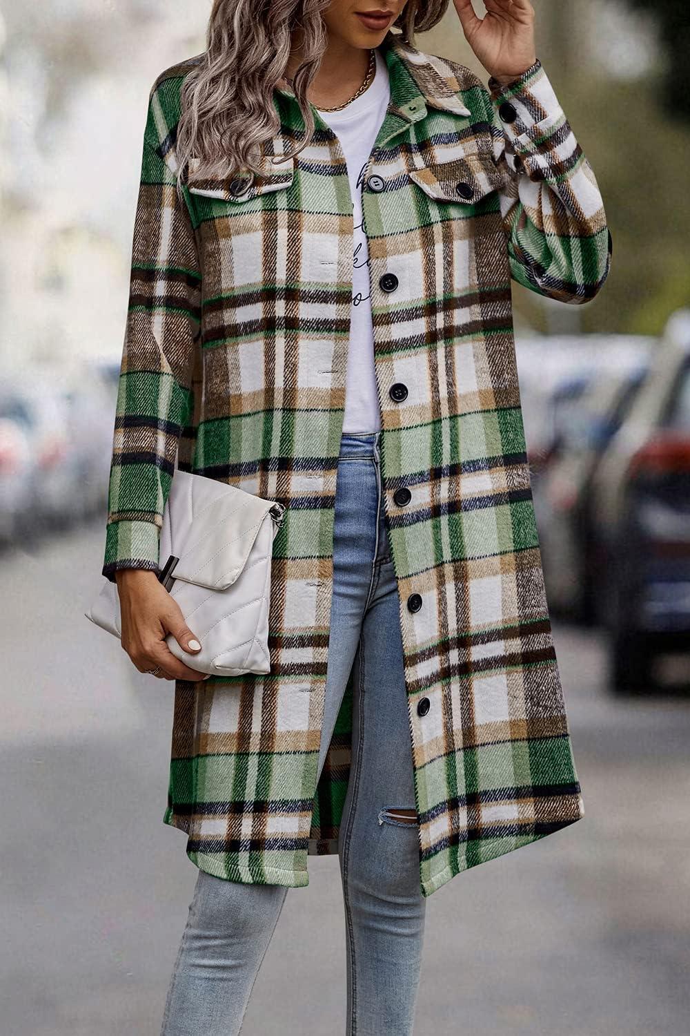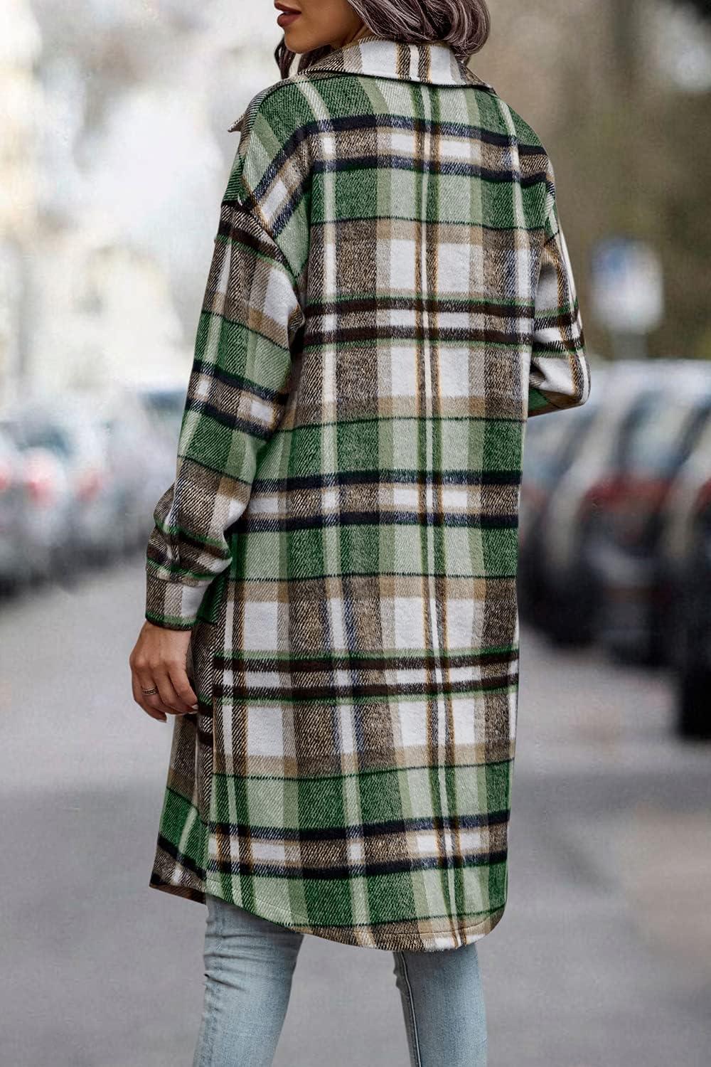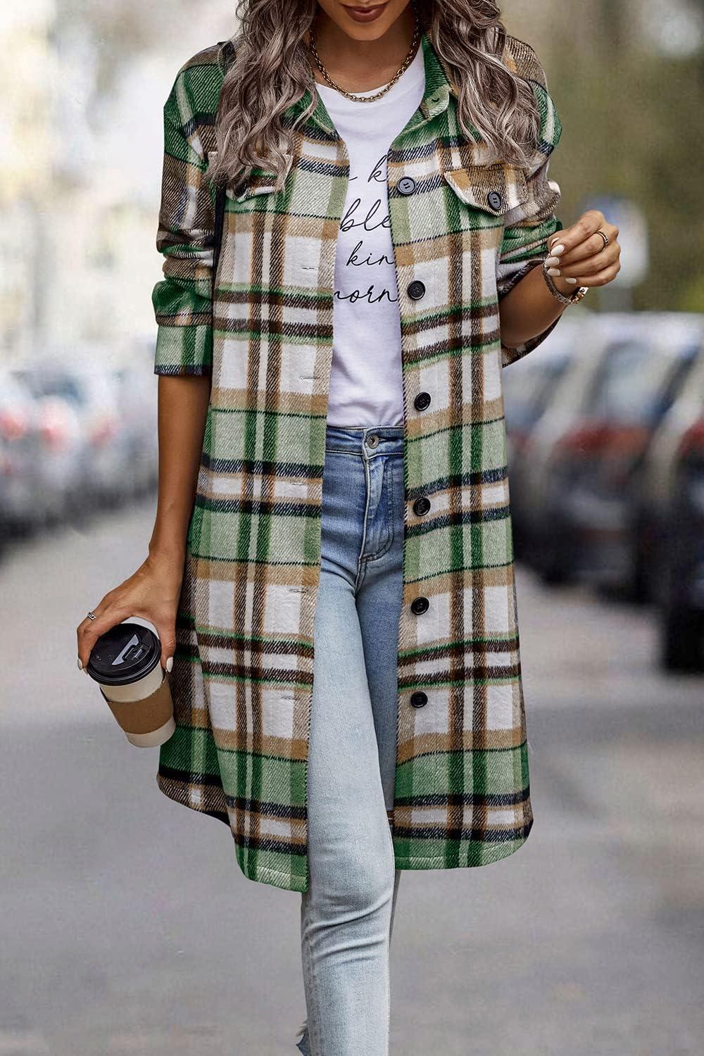 PRETTYGARDEN Womens Plaid Shacket Jacket Fall Fashion 2025 Long Sleeve Button Up Flannel Shirt Winter Clothing Woolen Coats(Green)