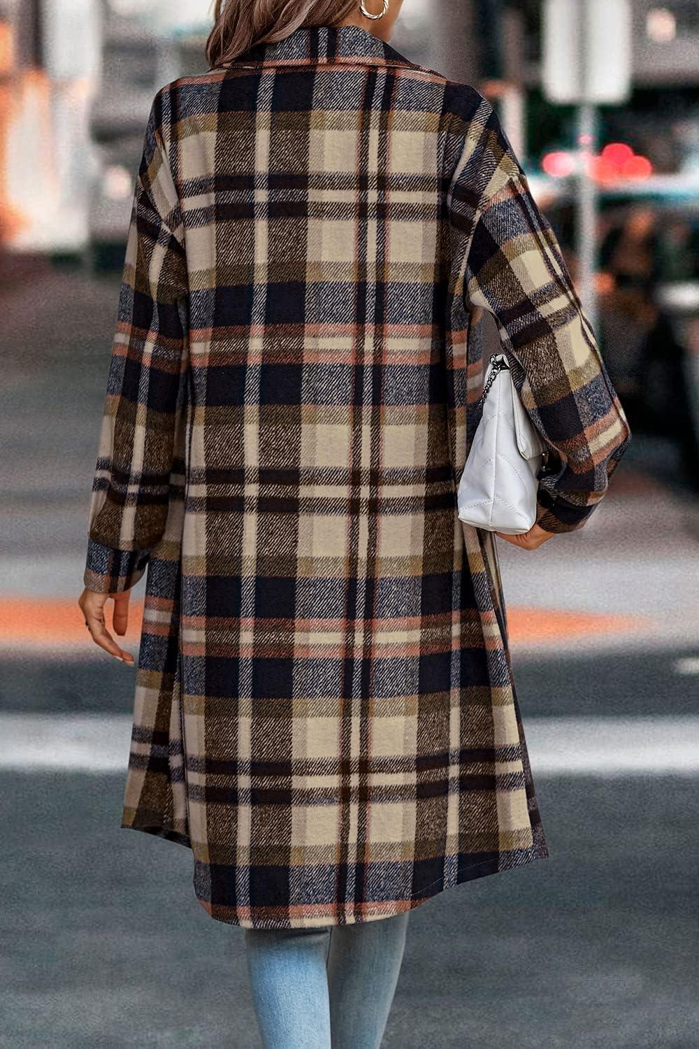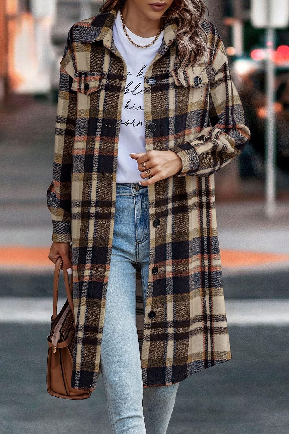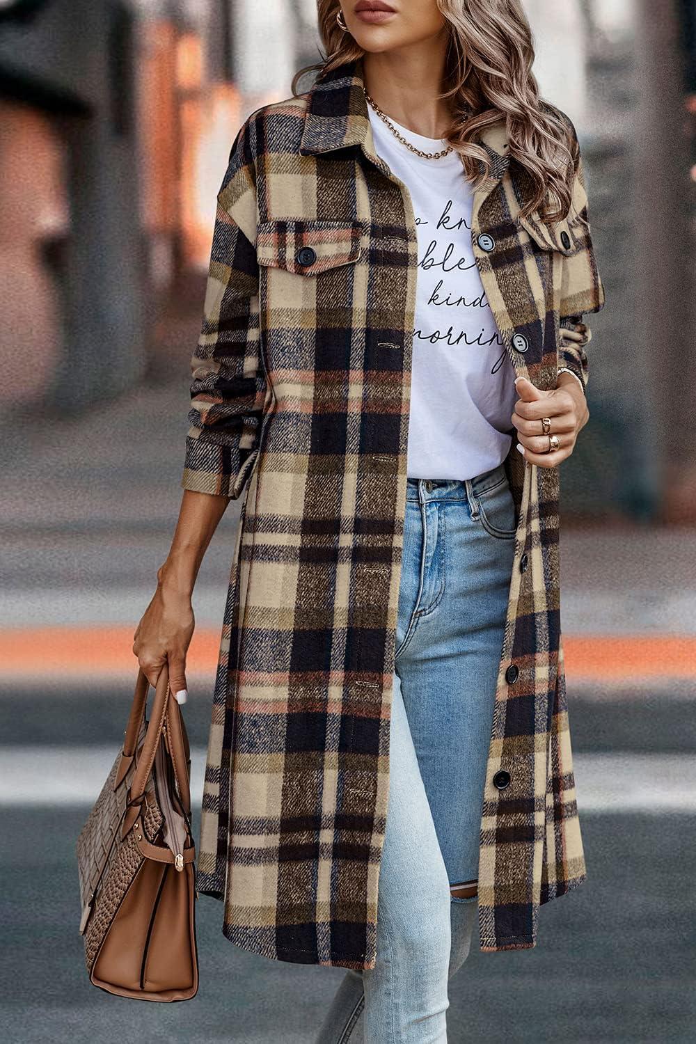PRETTYGARDEN Womens Plaid Shacket Jacket Fall Fashion 2025 Long Sleeve Button Up Flannel Shirt Winter Clothing Woolen Coats(Plaid Brown)