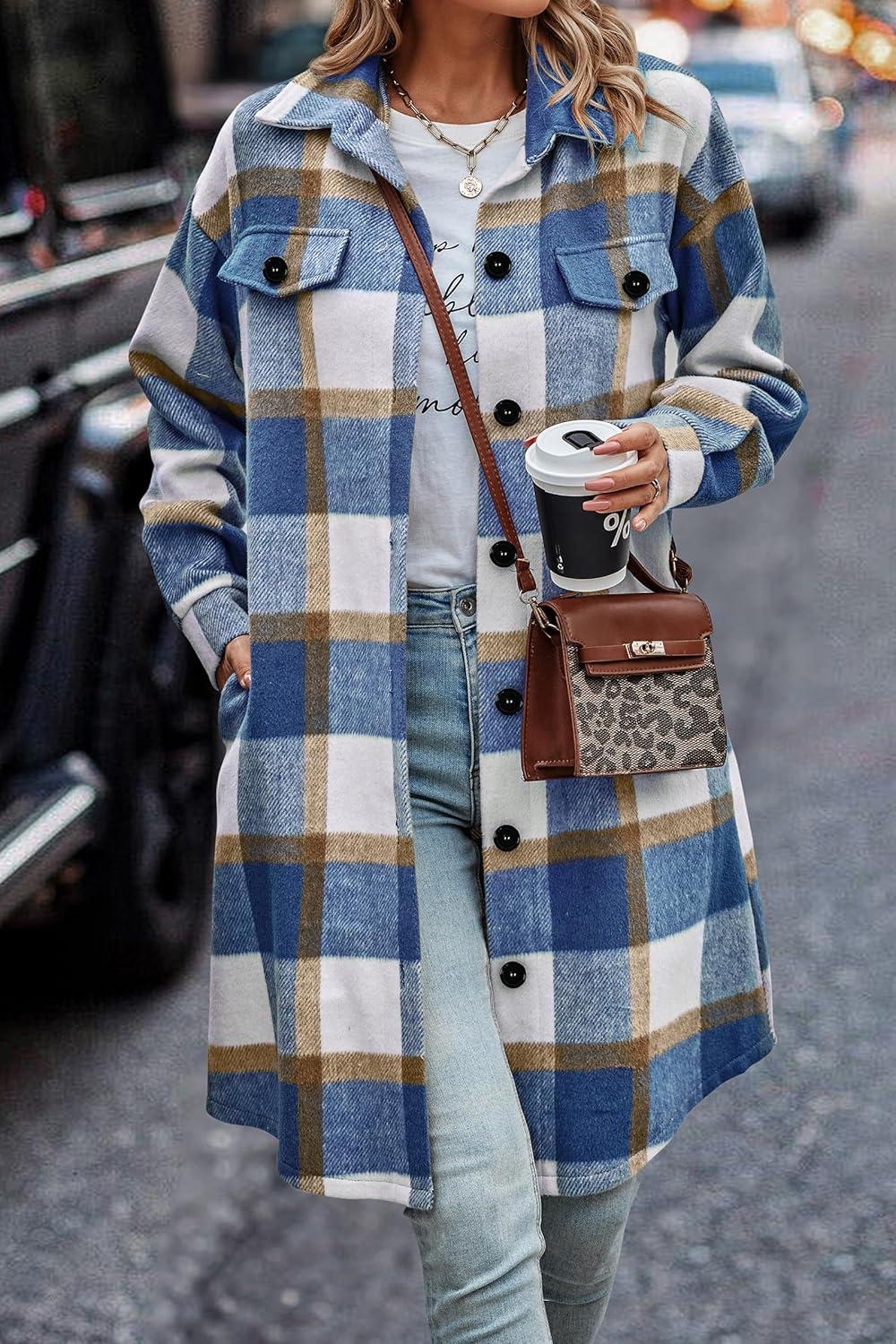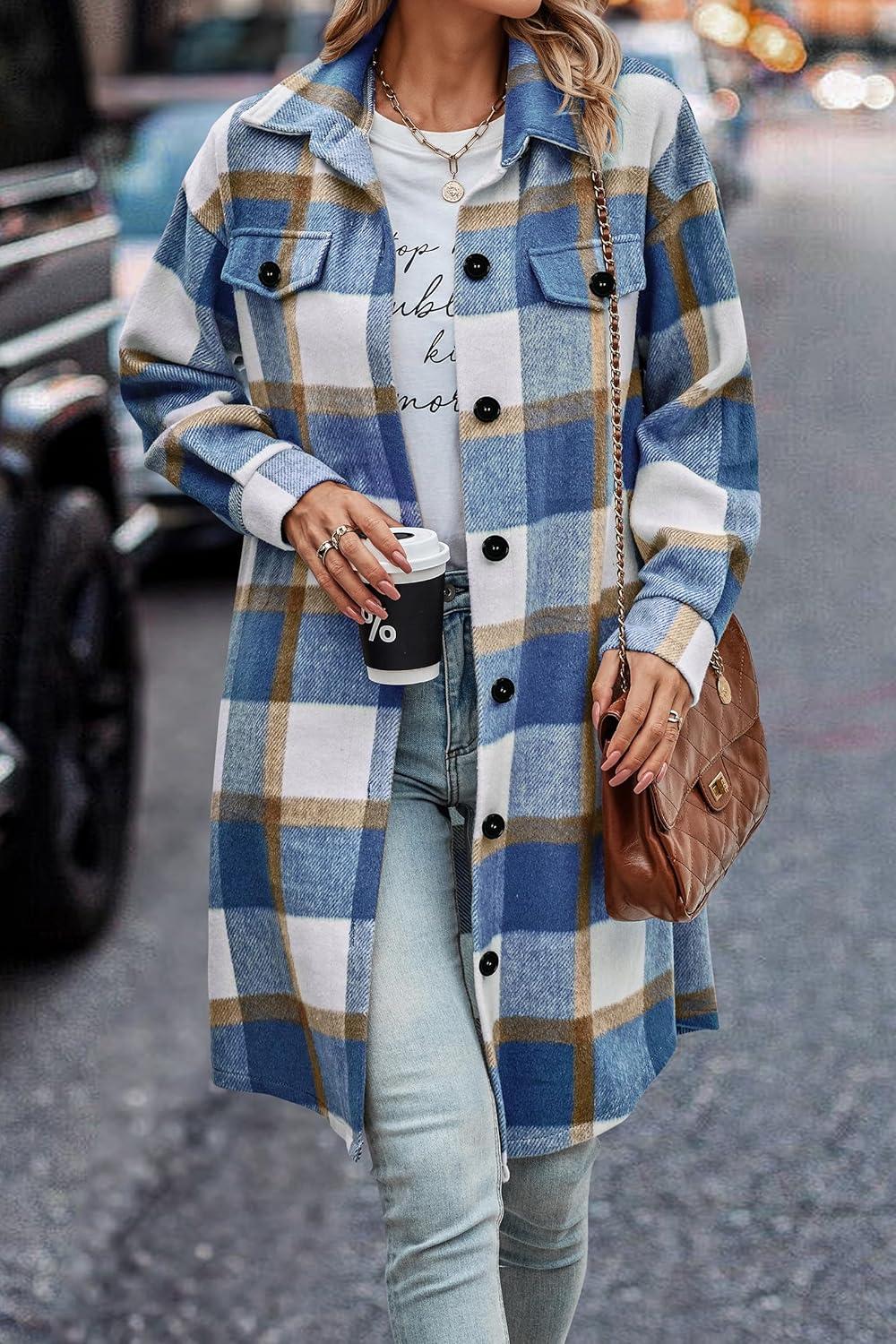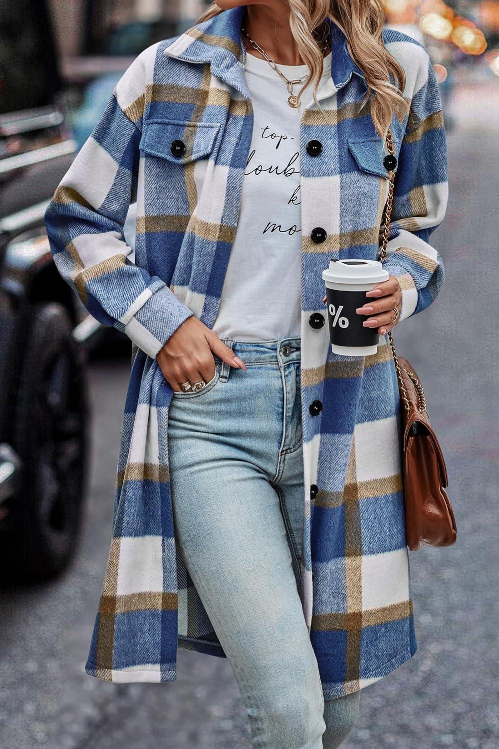 PRETTYGARDEN Womens Plaid Shacket Jacket Fall Fashion 2025 Long Sleeve Button Up Flannel Shirt Winter Clothing Woolen Coats(Plaid Blue White)