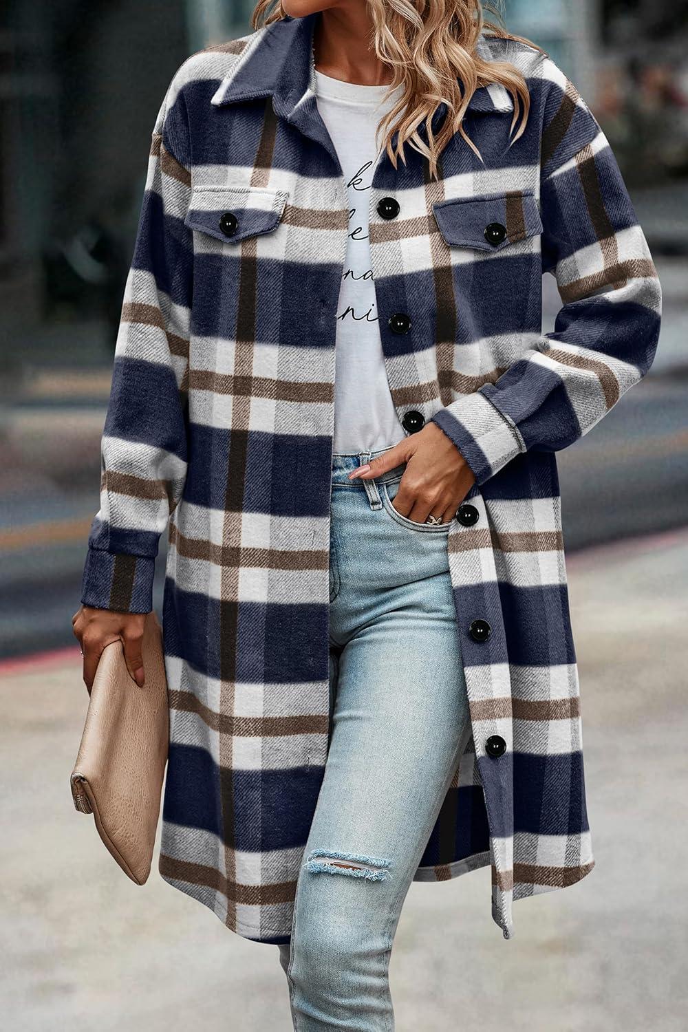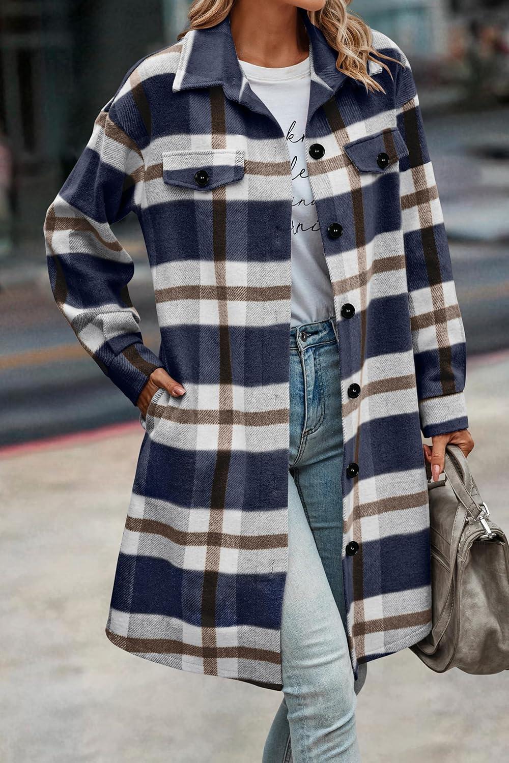 PRETTYGARDEN Womens Plaid Shacket Jacket Fall Fashion 2025 Long Sleeve Button Up Flannel Shirt Winter Clothing Woolen Coats(Plaid Navy)