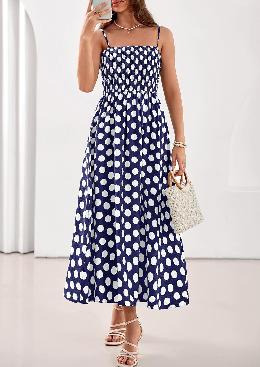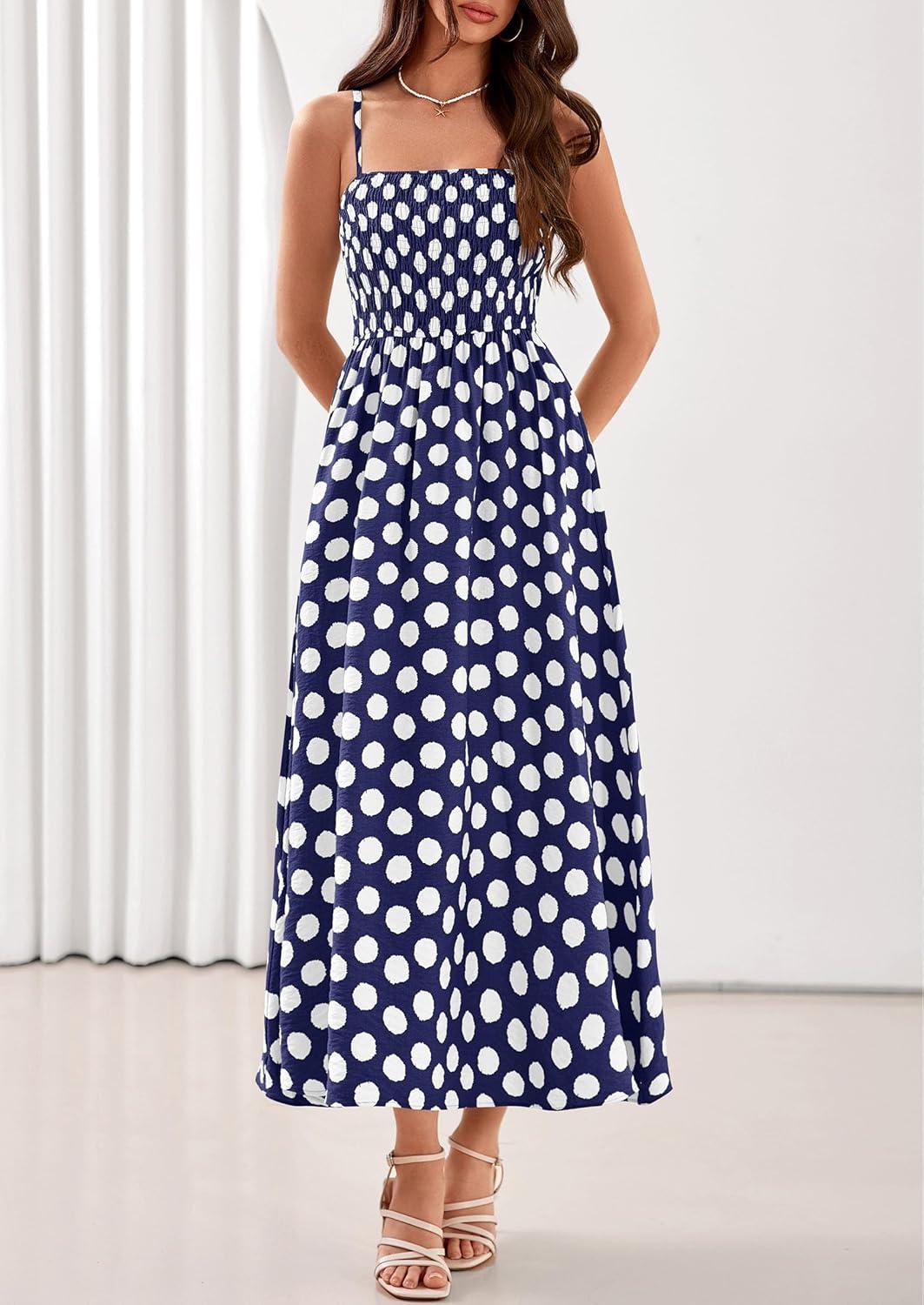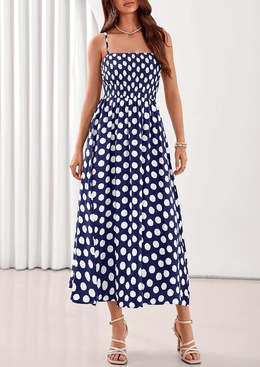 PRETTYGARDEN Womens Polka Dot Dress 2026 Summer Sleeveless Spaghetti Straps Smocked Sun Dress Flowy Spring Beach Midi Dresses(Navy Blue)