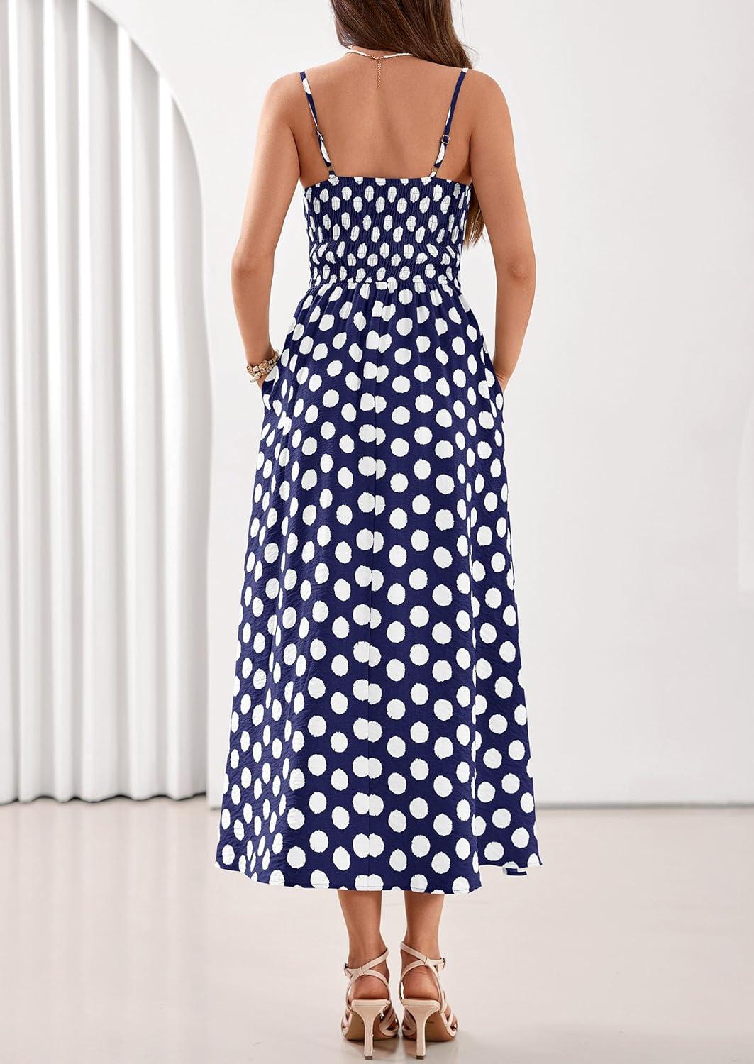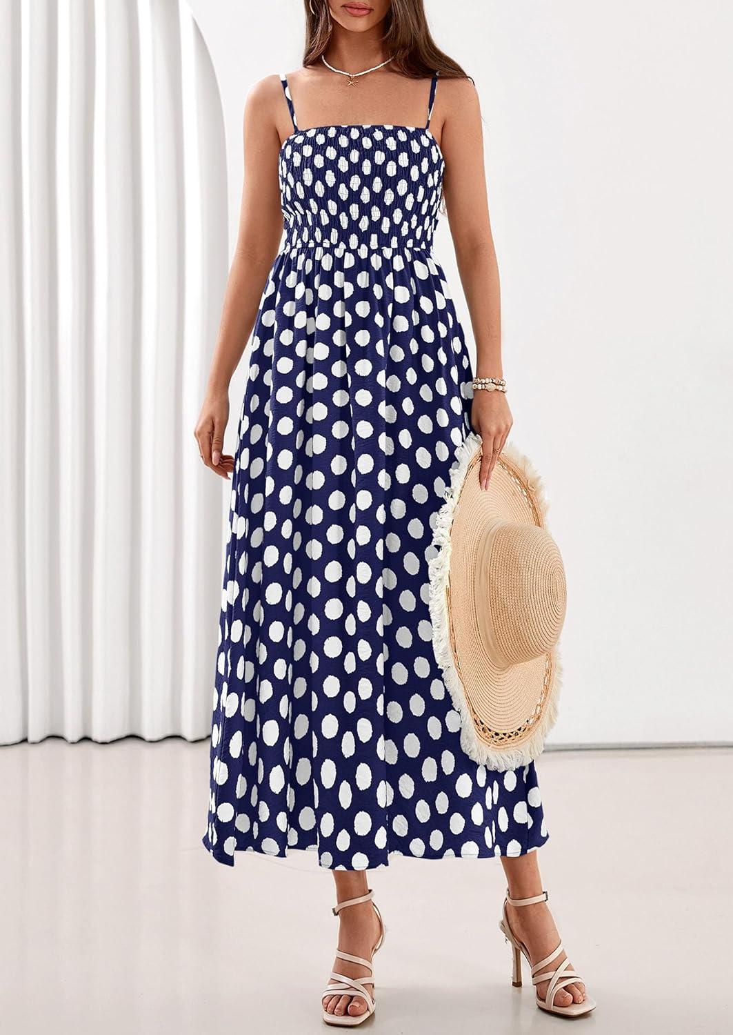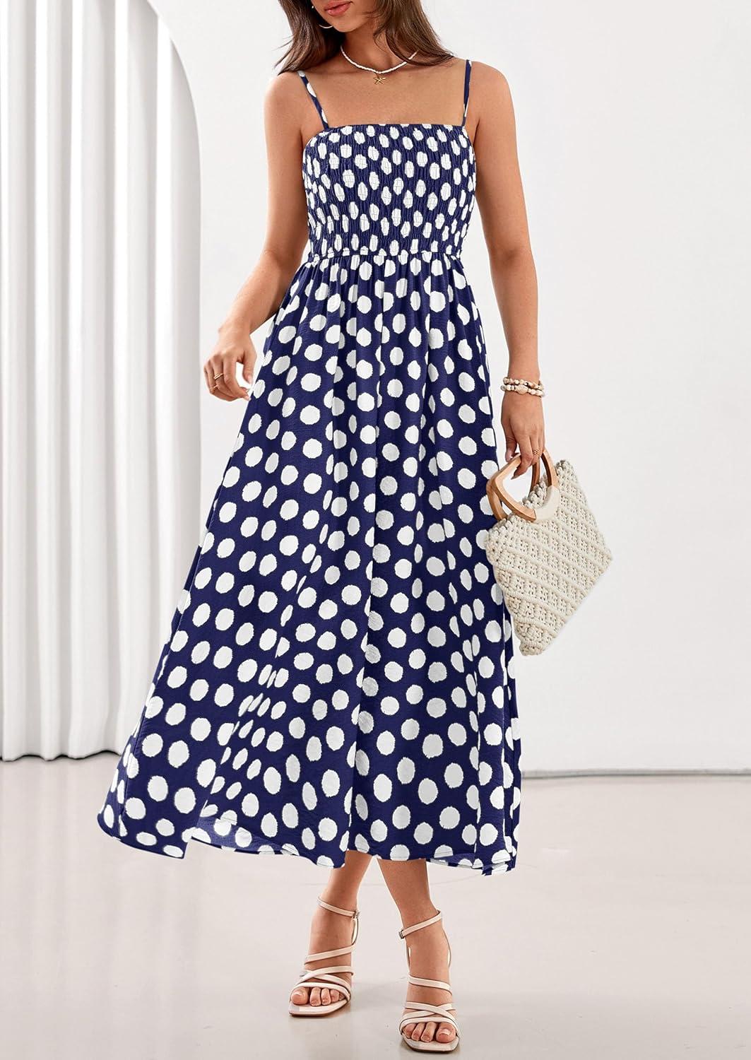 PRETTYGARDEN Womens Polka Dot Dress 2026 Summer Sleeveless Spaghetti Straps Smocked Sun Dress Flowy Spring Beach Midi Dresses(Navy Blue)