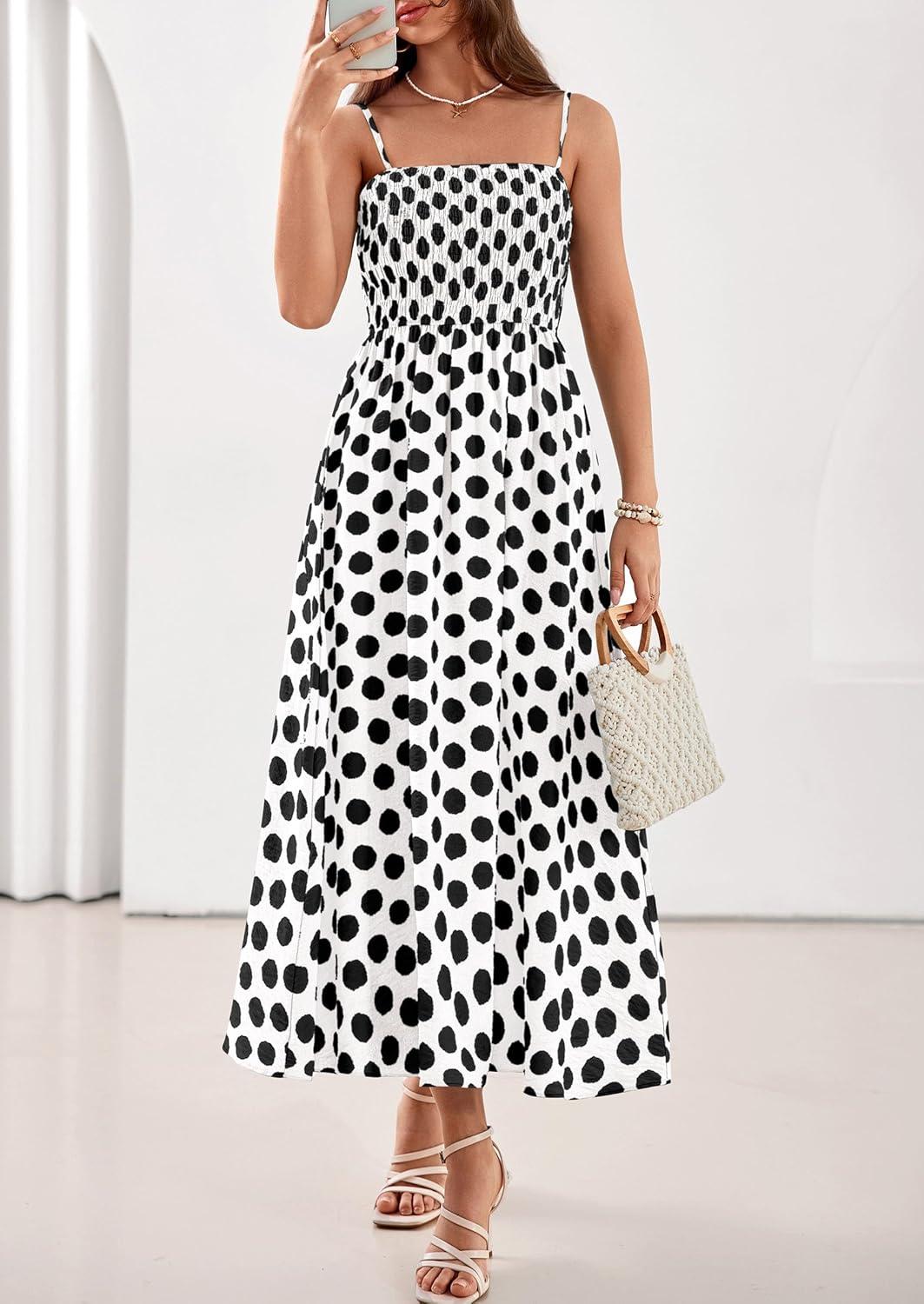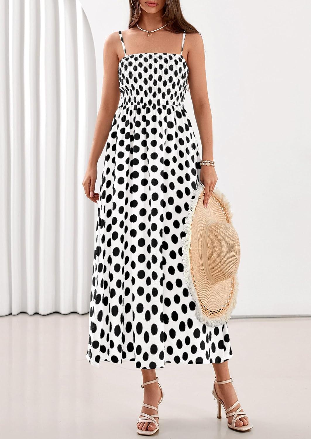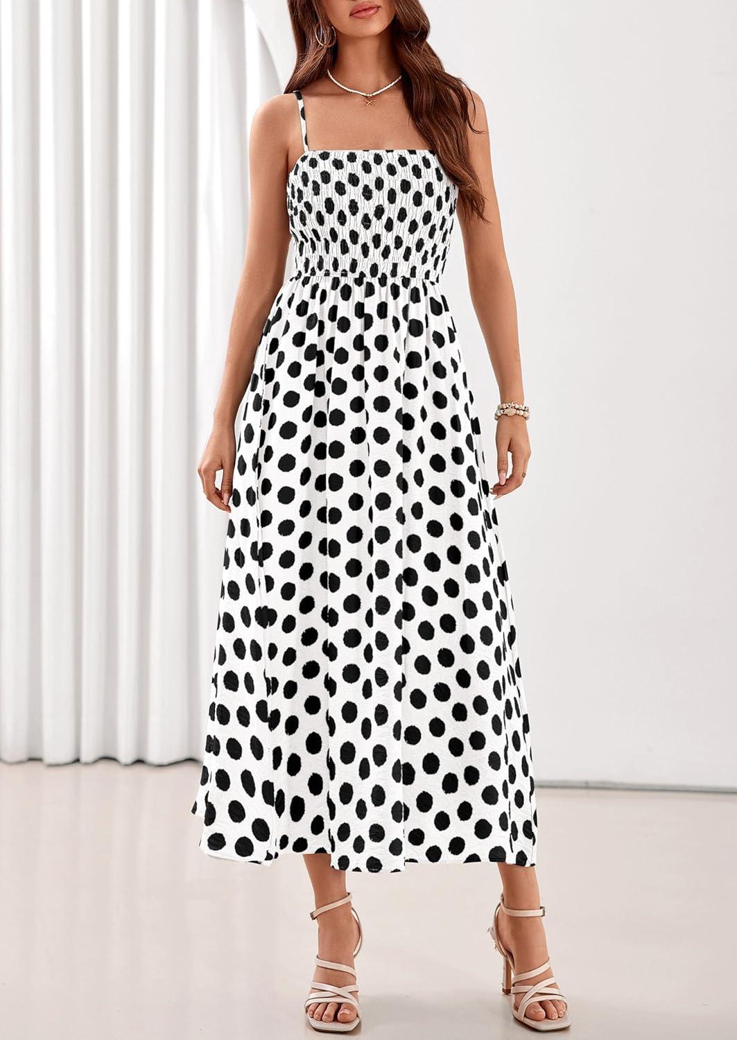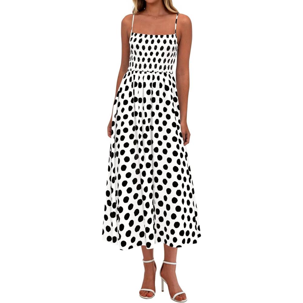 PRETTYGARDEN Womens Polka Dot Dress 2026 Summer Sleeveless Spaghetti Straps Smocked Sun Dress Flowy Spring Beach Midi Dresses(White)