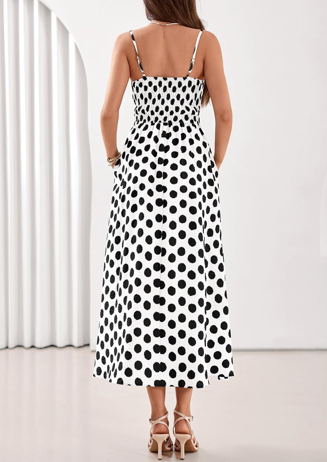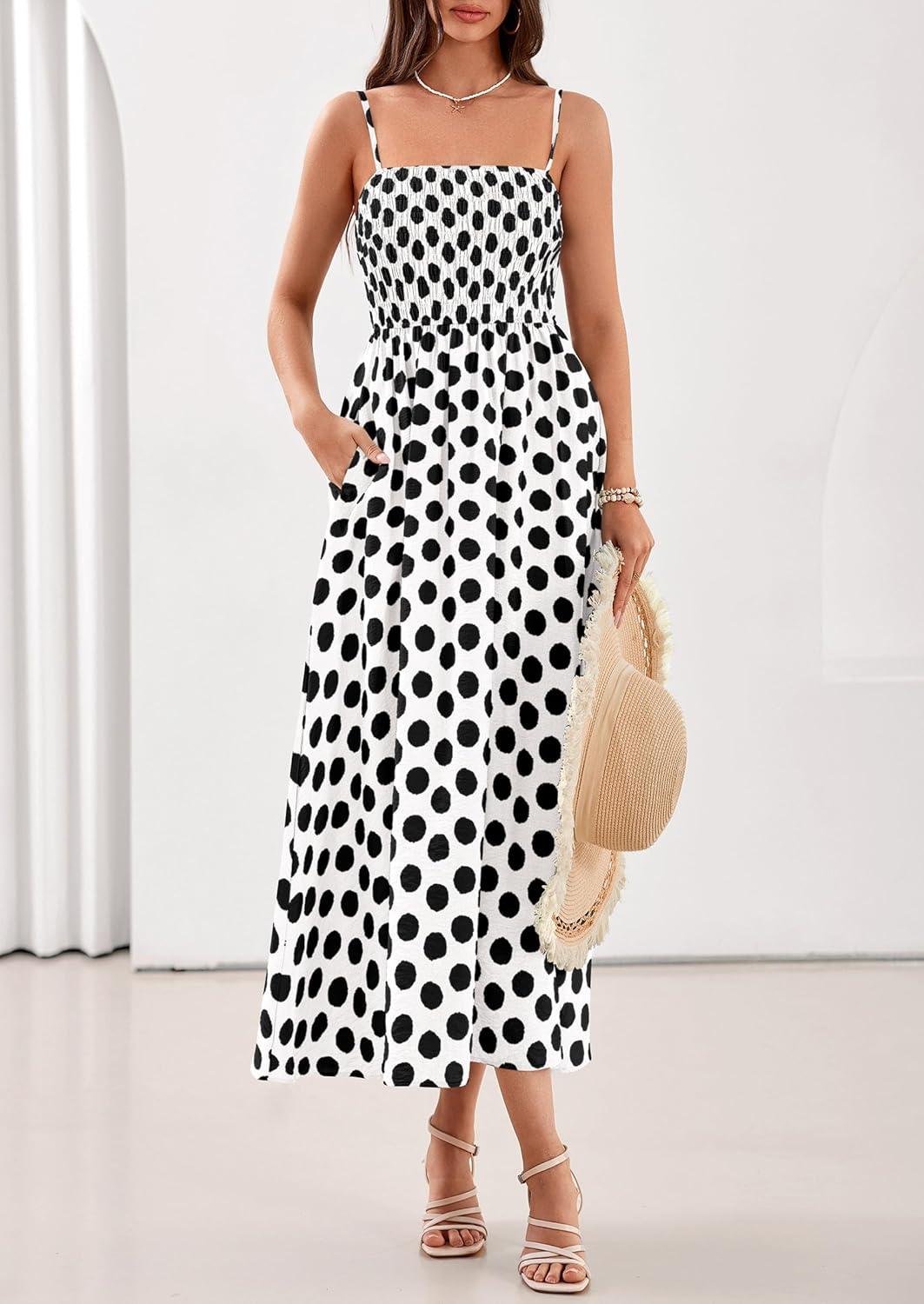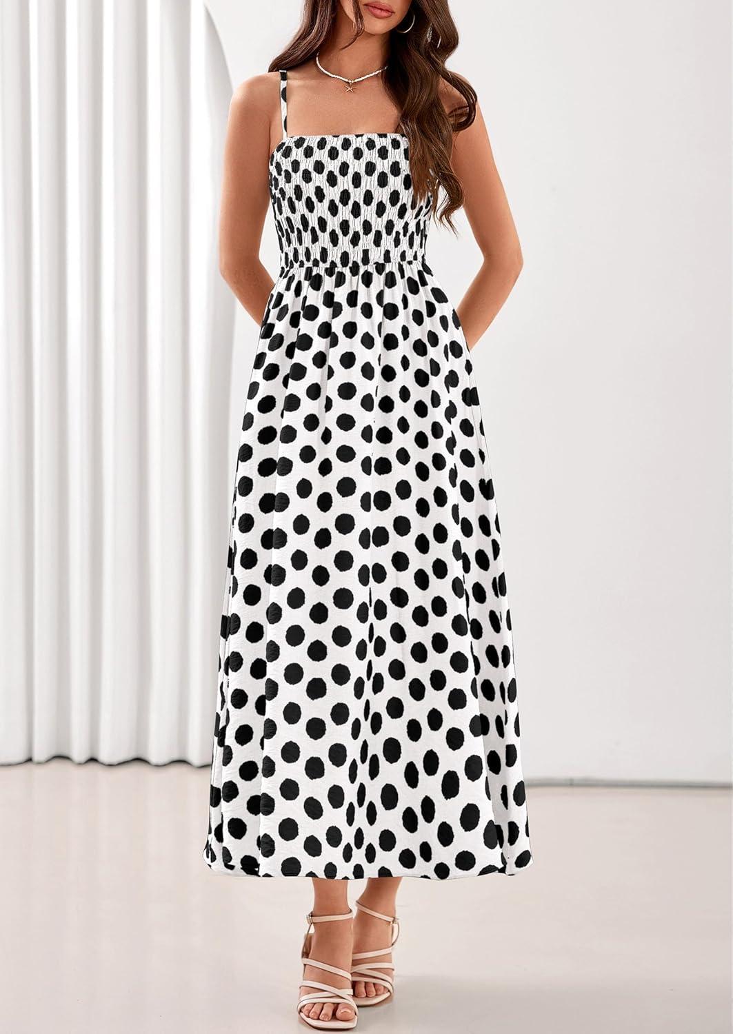 PRETTYGARDEN Womens Polka Dot Dress 2026 Summer Sleeveless Spaghetti Straps Smocked Sun Dress Flowy Spring Beach Midi Dresses(White)