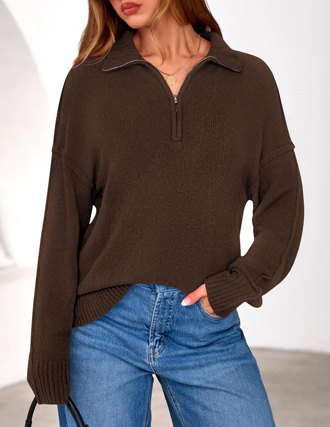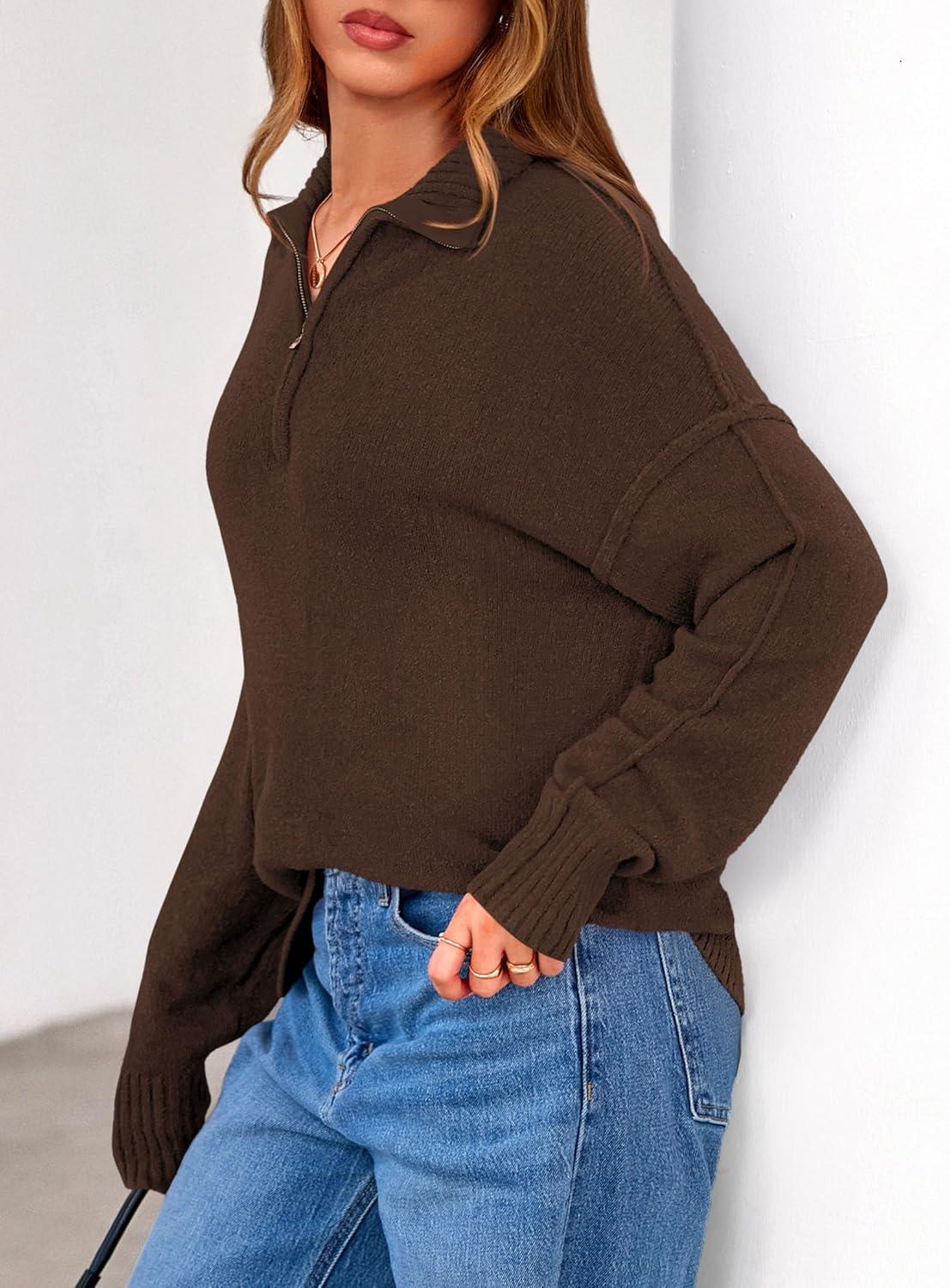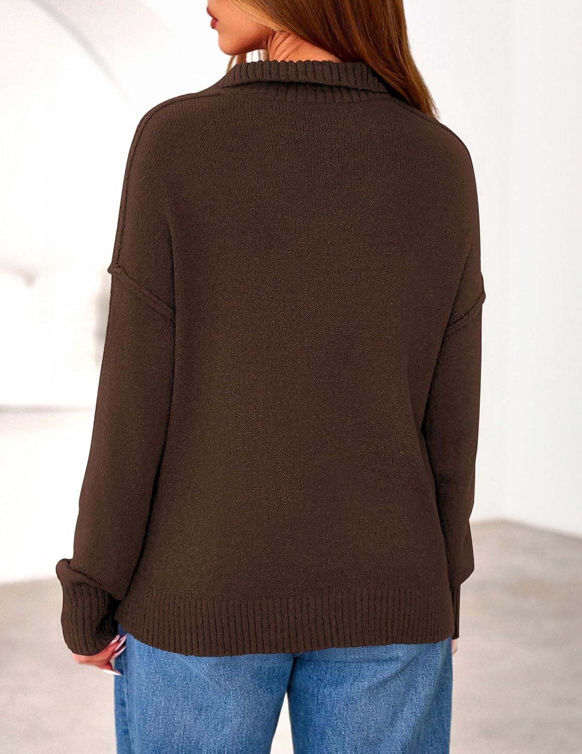PRETTYGARDEN Womens Quarter Zip Pullover V Neck Fall Sweaters 2025 Long Sleeve Tops Collared Business Casual Winter Clothing(Brown)