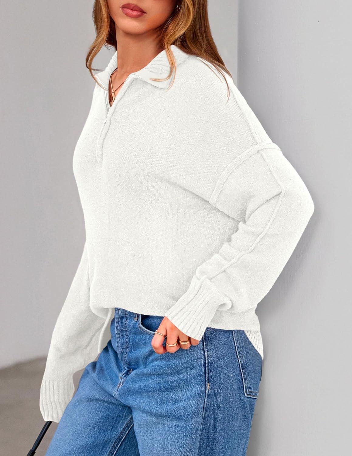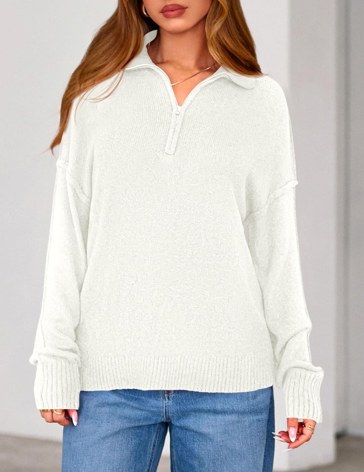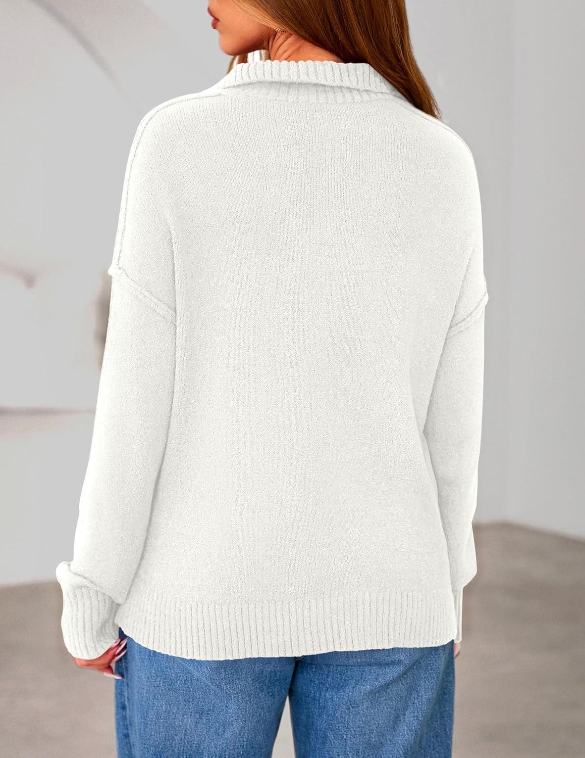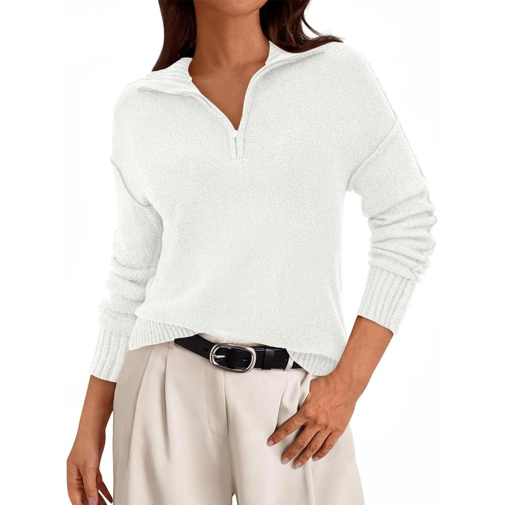 PRETTYGARDEN Womens Quarter Zip Pullover V Neck Fall Sweaters 2025 Long Sleeve Tops Collared Business Casual Winter Clothing(White)
