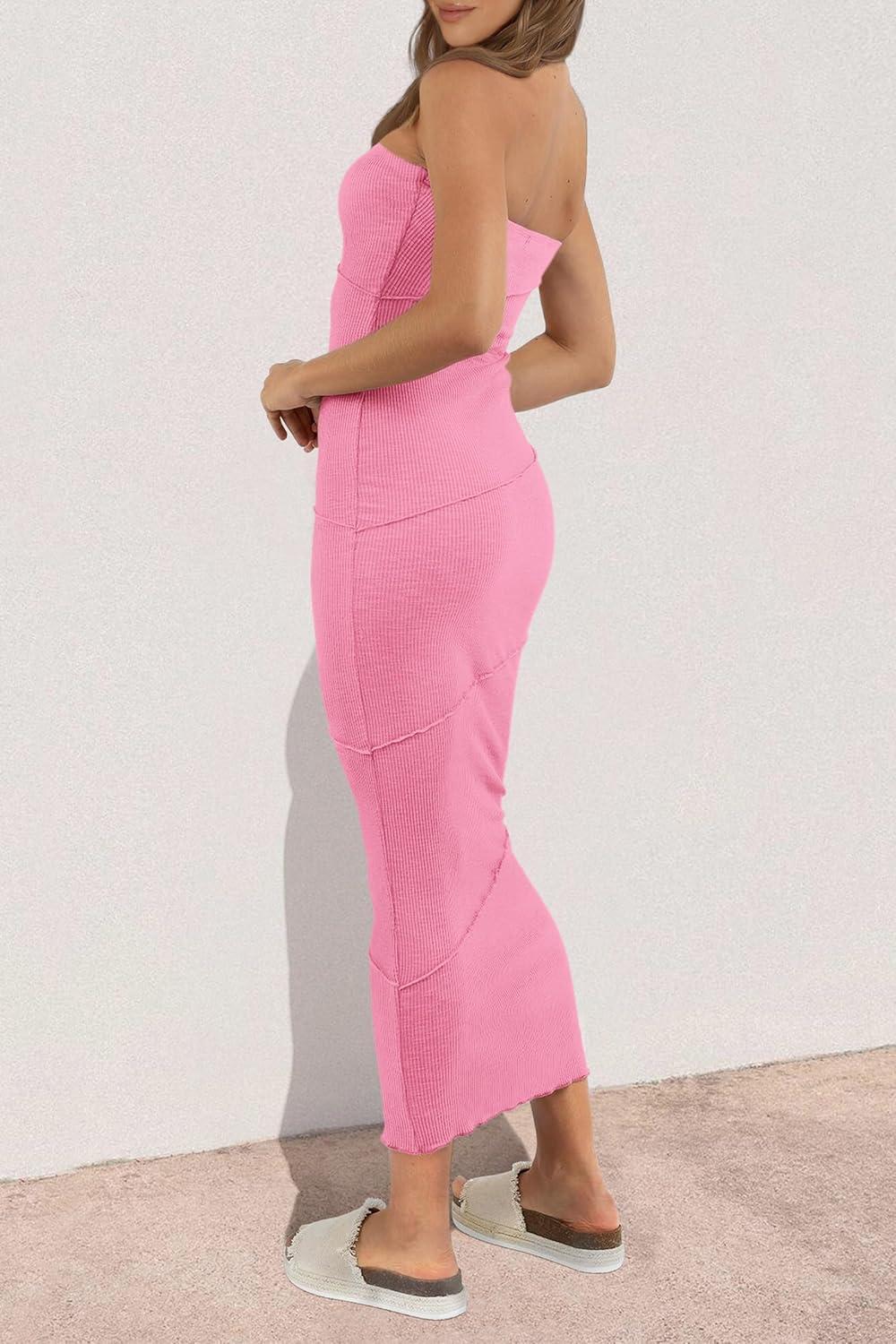 PRETTYGARDEN Women's Ribbed Maxi Bodycon Dress Summer Strapless Tube Y2K Party Club Long Dresses(Pink)