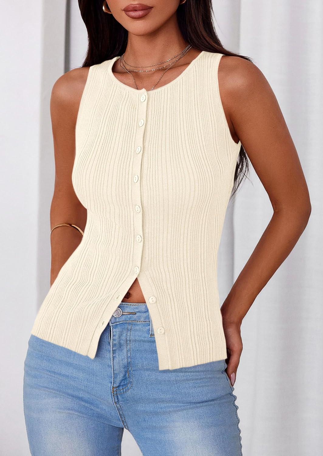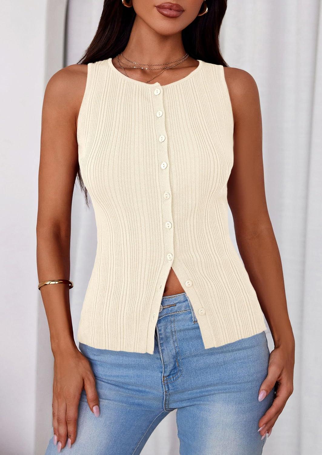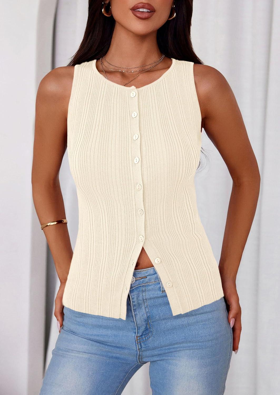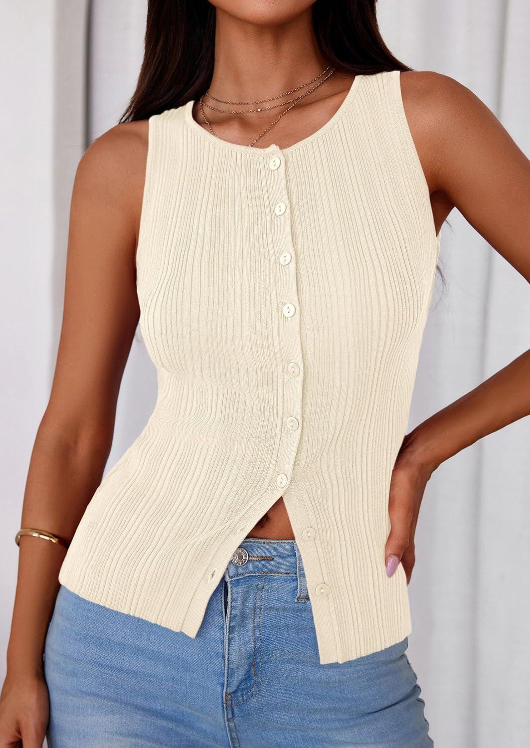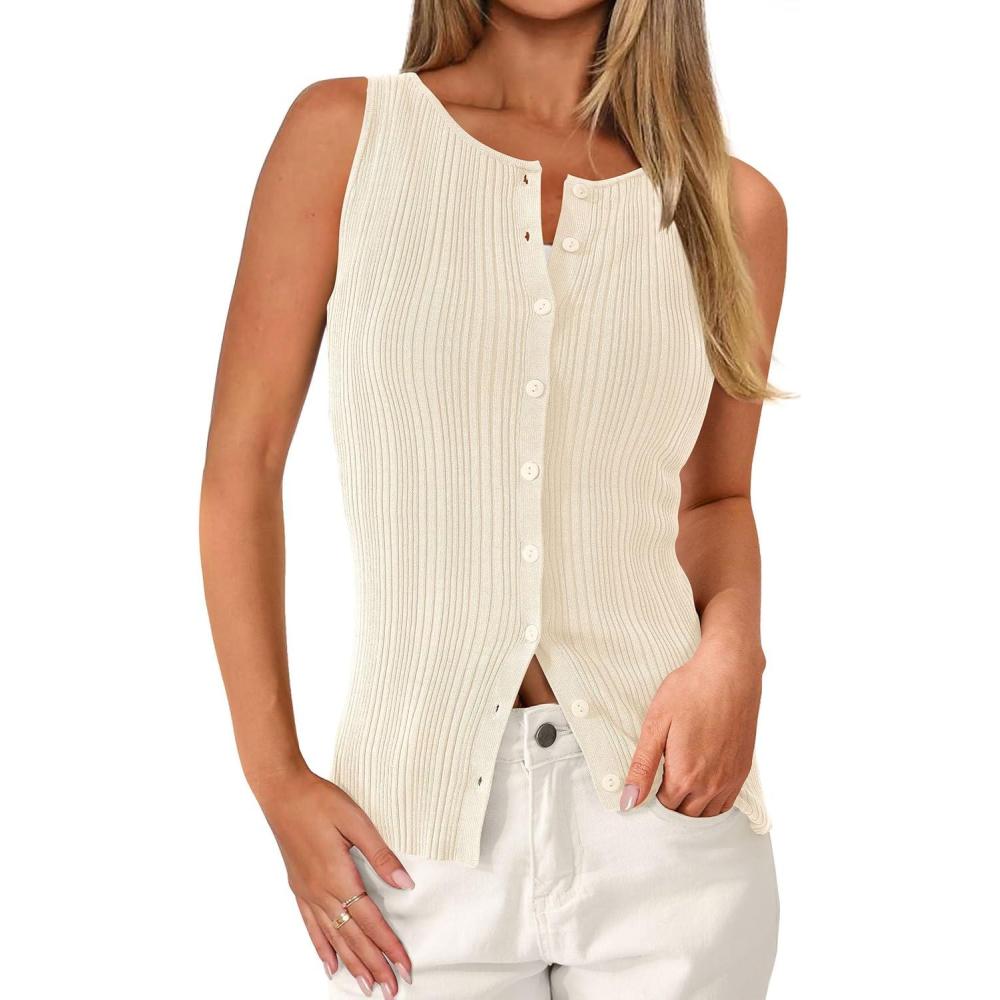 PRETTYGARDEN Womens Ribbed Tank Top Summer 2025 Open Front Button Down Sleeveless Shirts Fashion Clothing Going Out Vest Tops(Apricot)