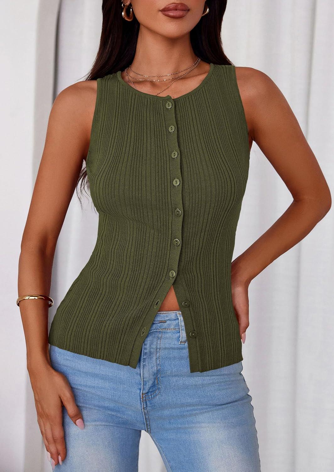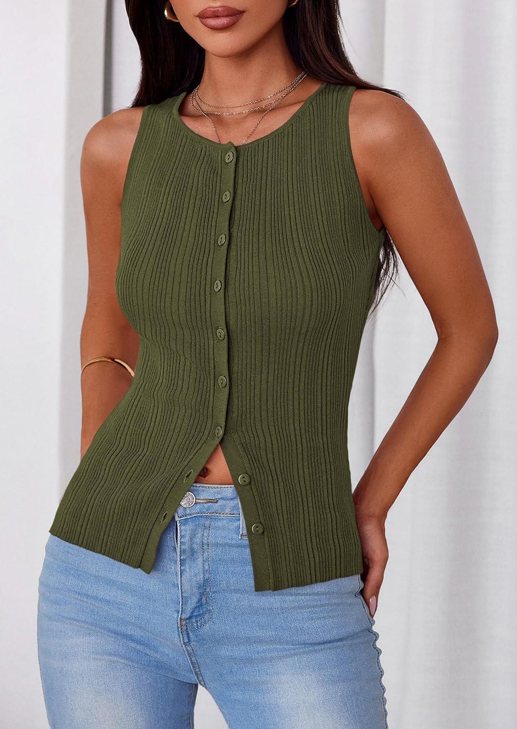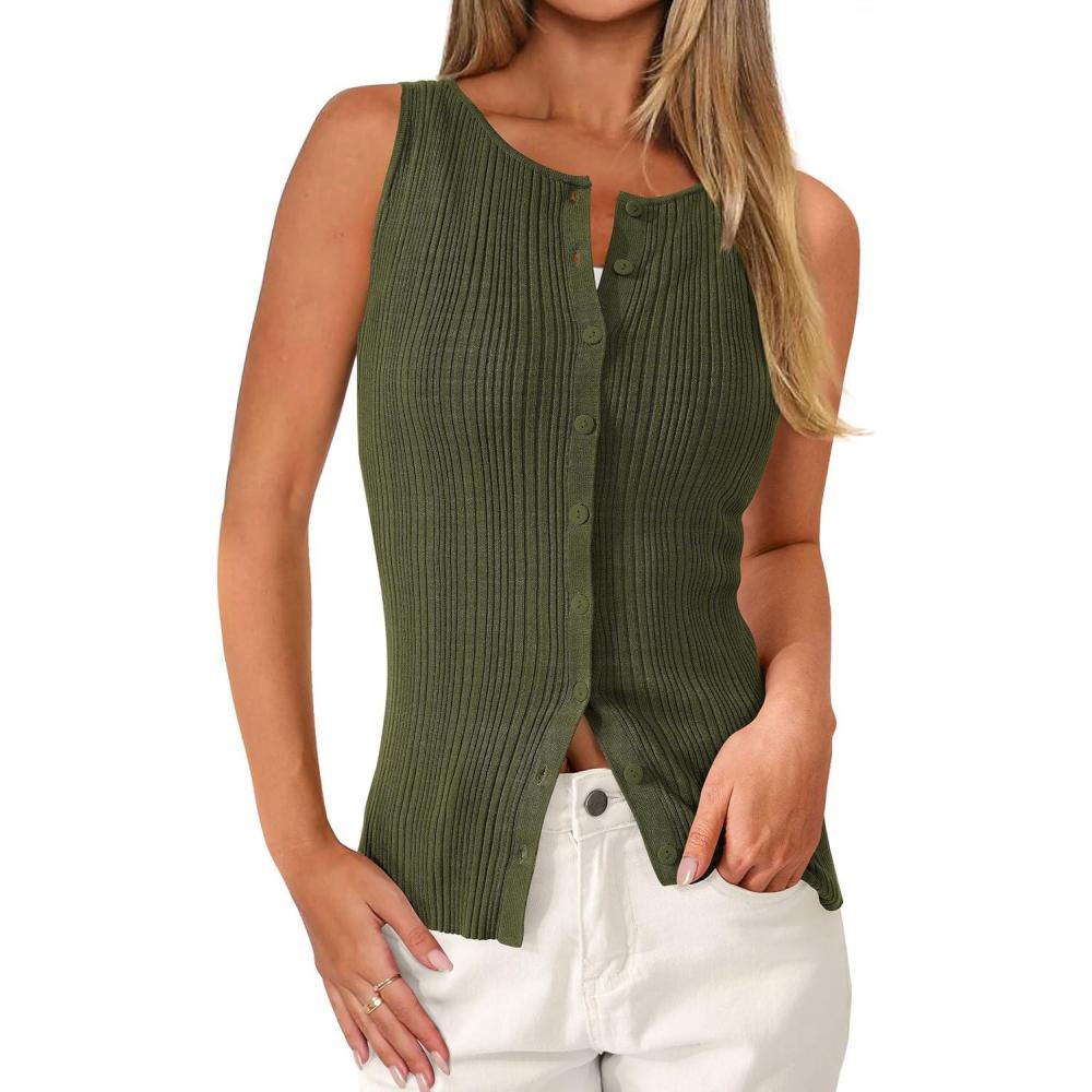 PRETTYGARDEN Womens Ribbed Tank Top Summer 2025 Open Front Button Down Sleeveless Shirts Fashion Clothing Going Out Vest Tops(Army Green)