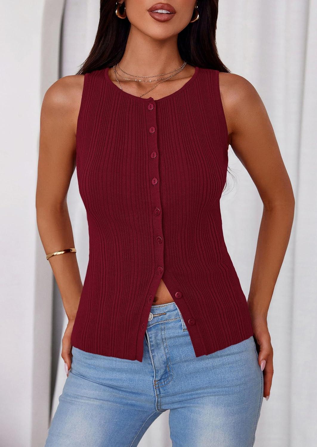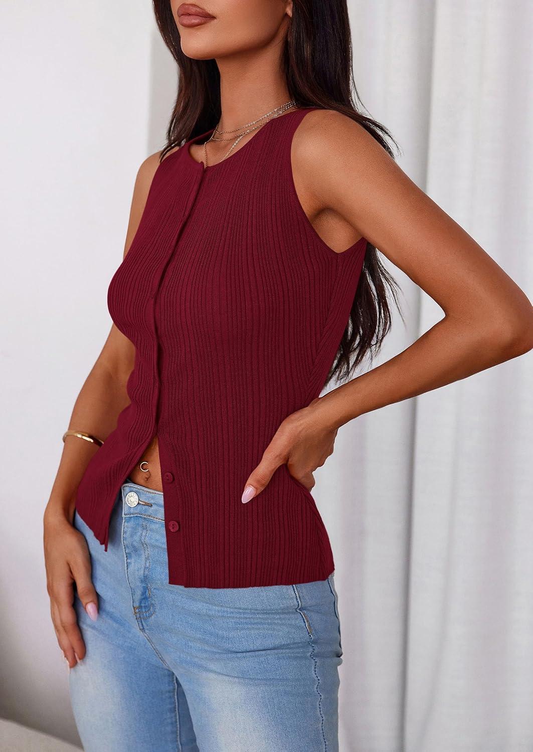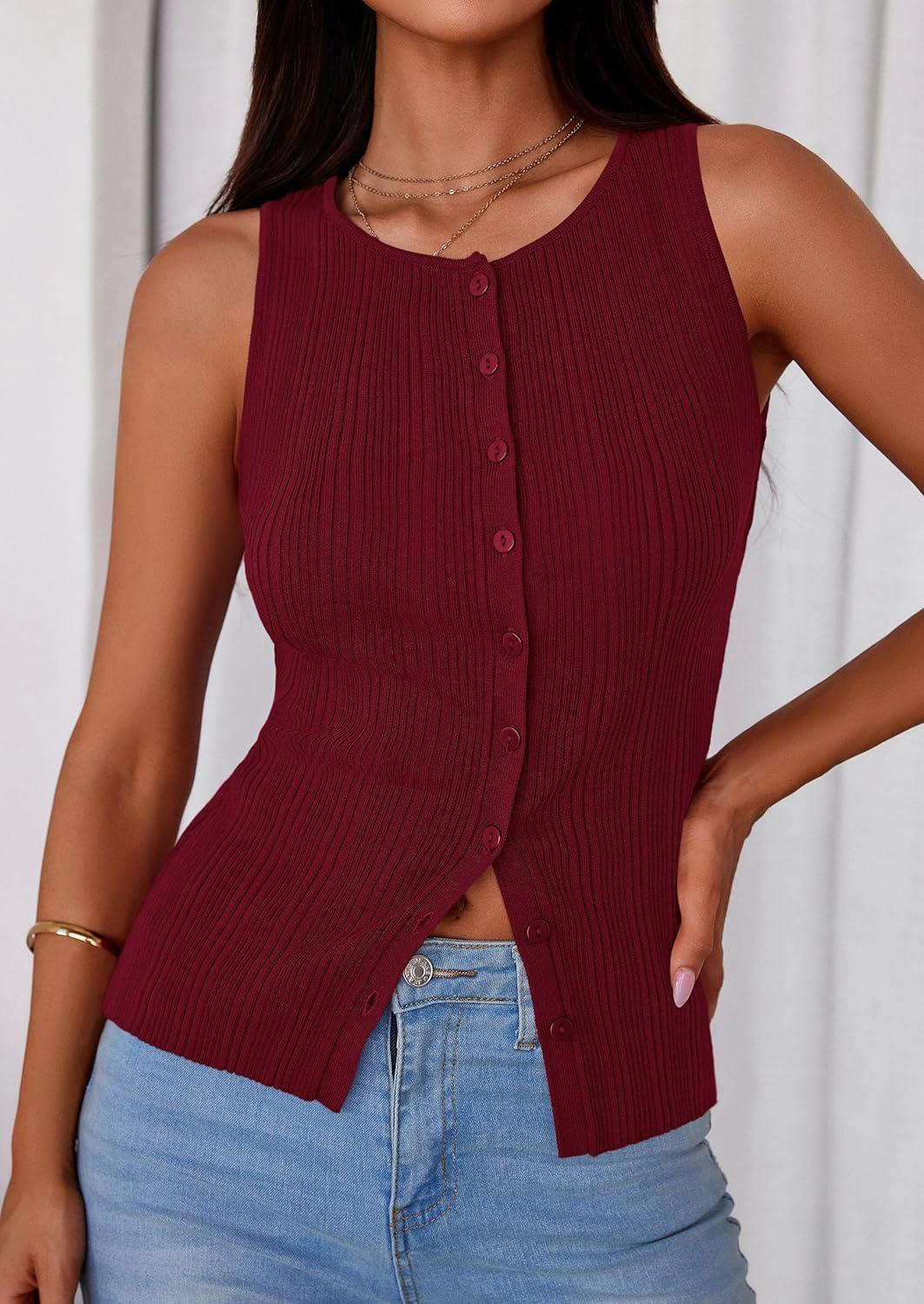 PRETTYGARDEN Womens Ribbed Tank Top Summer 2025 Open Front Button Down Sleeveless Shirts Fashion Clothing Going Out Vest Tops(Wine Red)