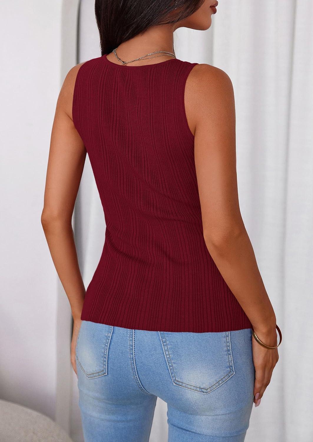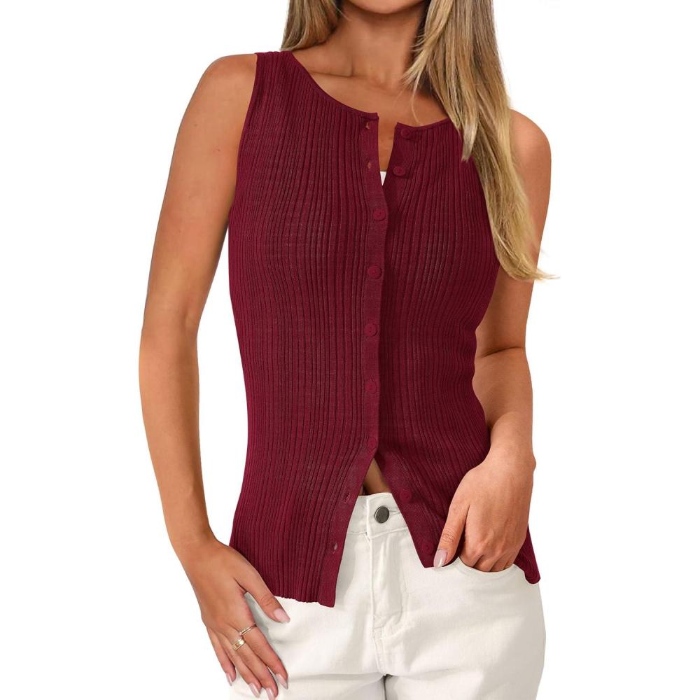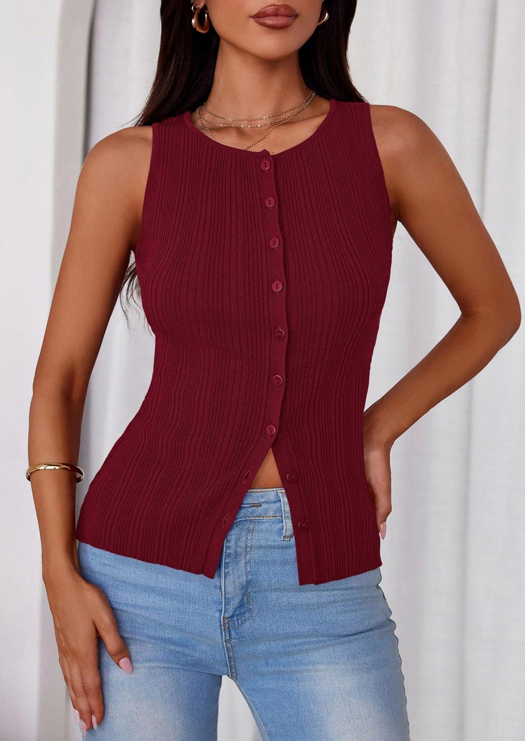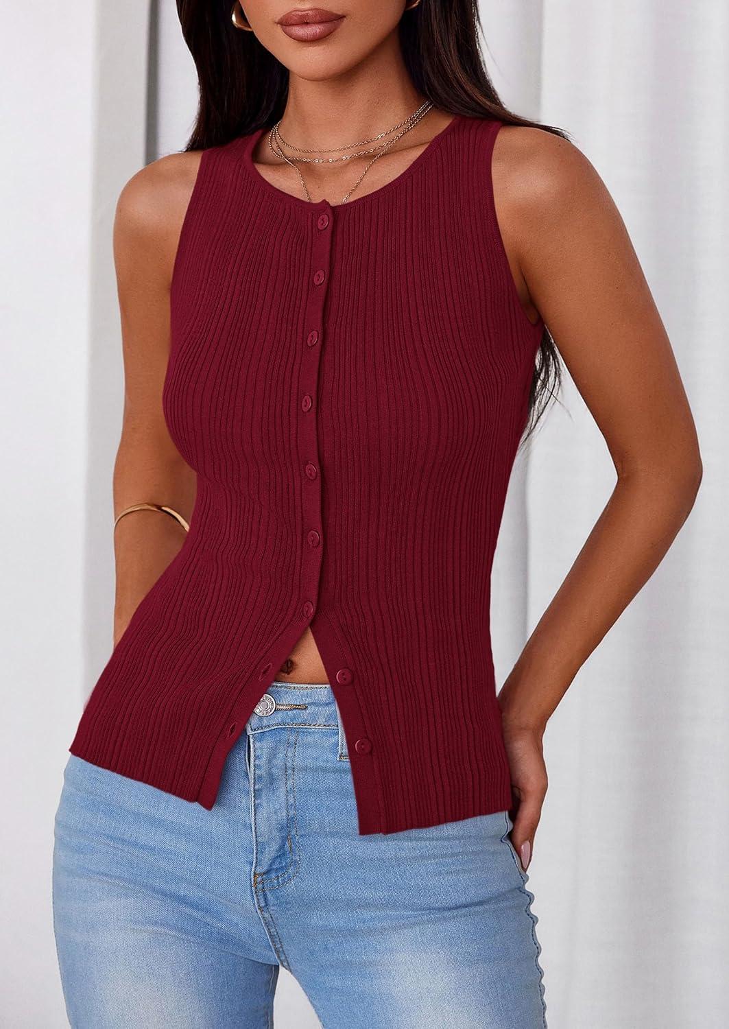 PRETTYGARDEN Womens Ribbed Tank Top Summer 2025 Open Front Button Down Sleeveless Shirts Fashion Clothing Going Out Vest Tops(Wine Red)