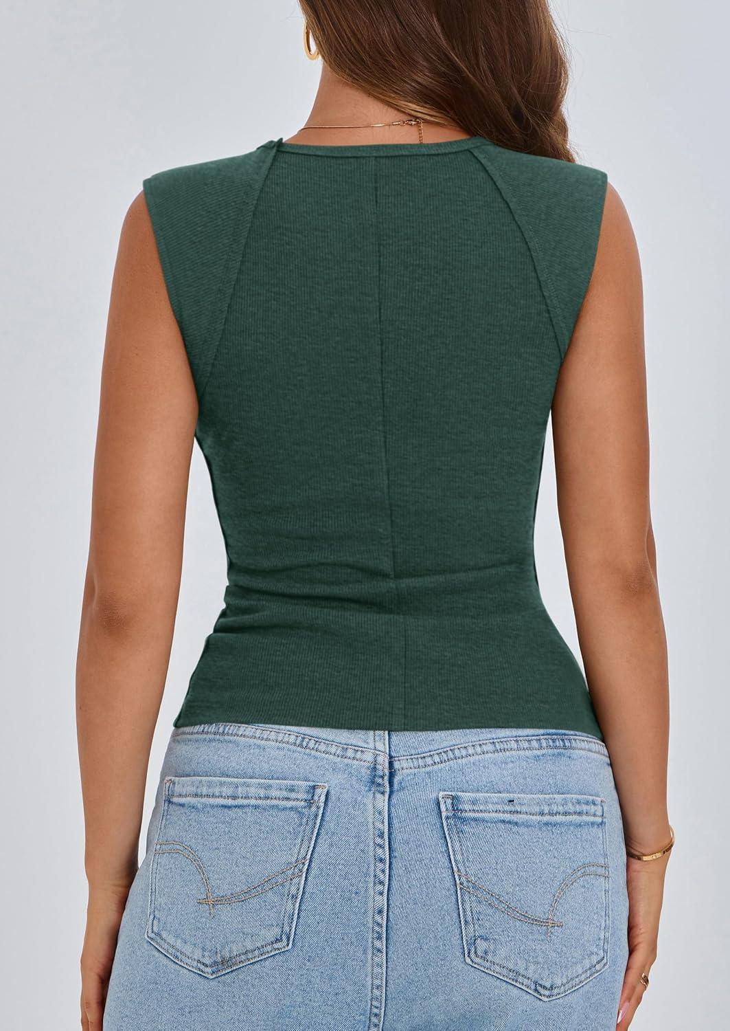 PRETTYGARDEN Women's Ribbed Tank Tops 2025 Summer Cap Sleeve Slim Fitted Knit Basic Casual Tee Shirts Trendy Fashion Clothes(Dark Green)