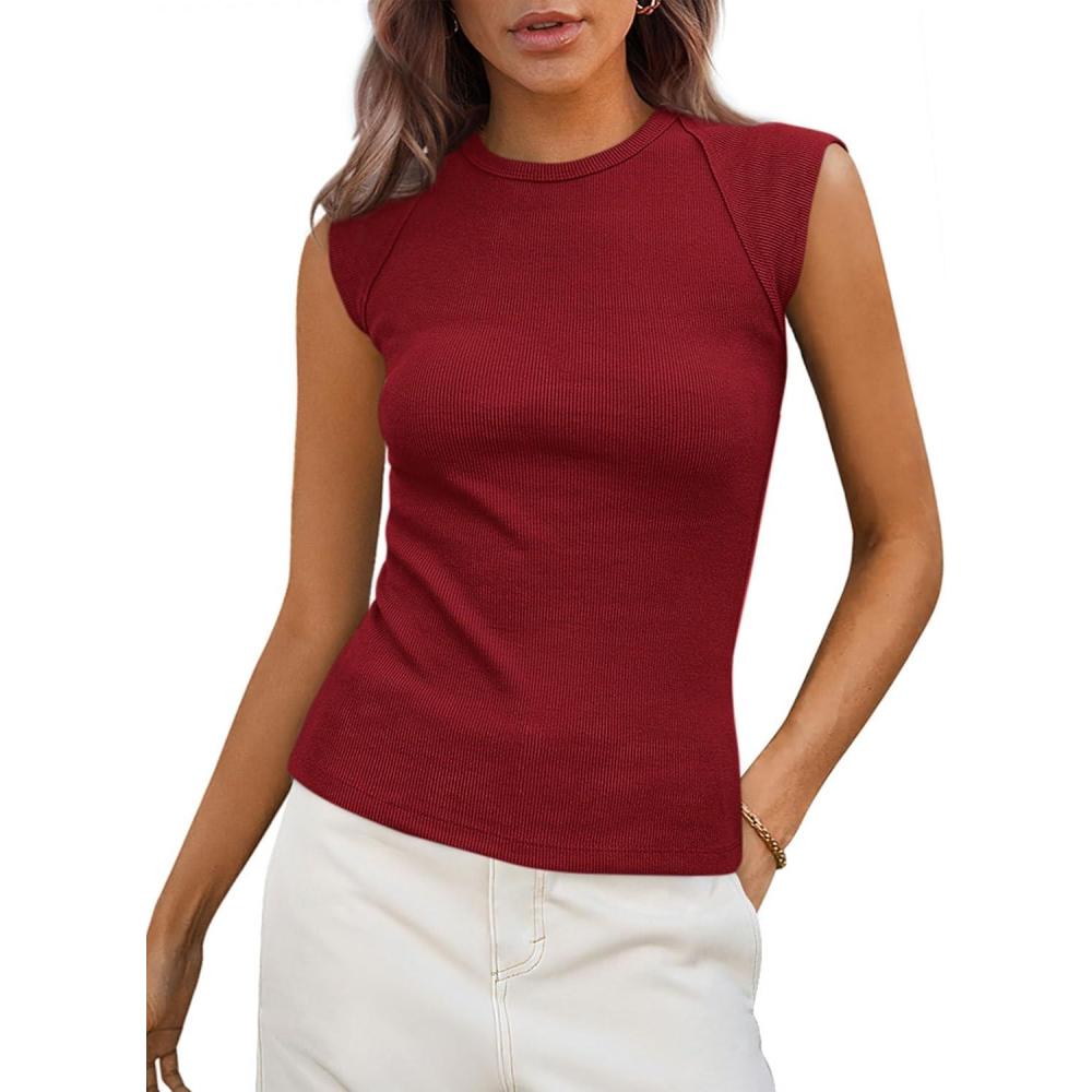 PRETTYGARDEN Women’s Ribbed Tank Tops 2025 Summer Cap Sleeve Slim Fitted Knit Basic Casual Tee Shirts Trendy Fashion Clothes(Wine Red)
