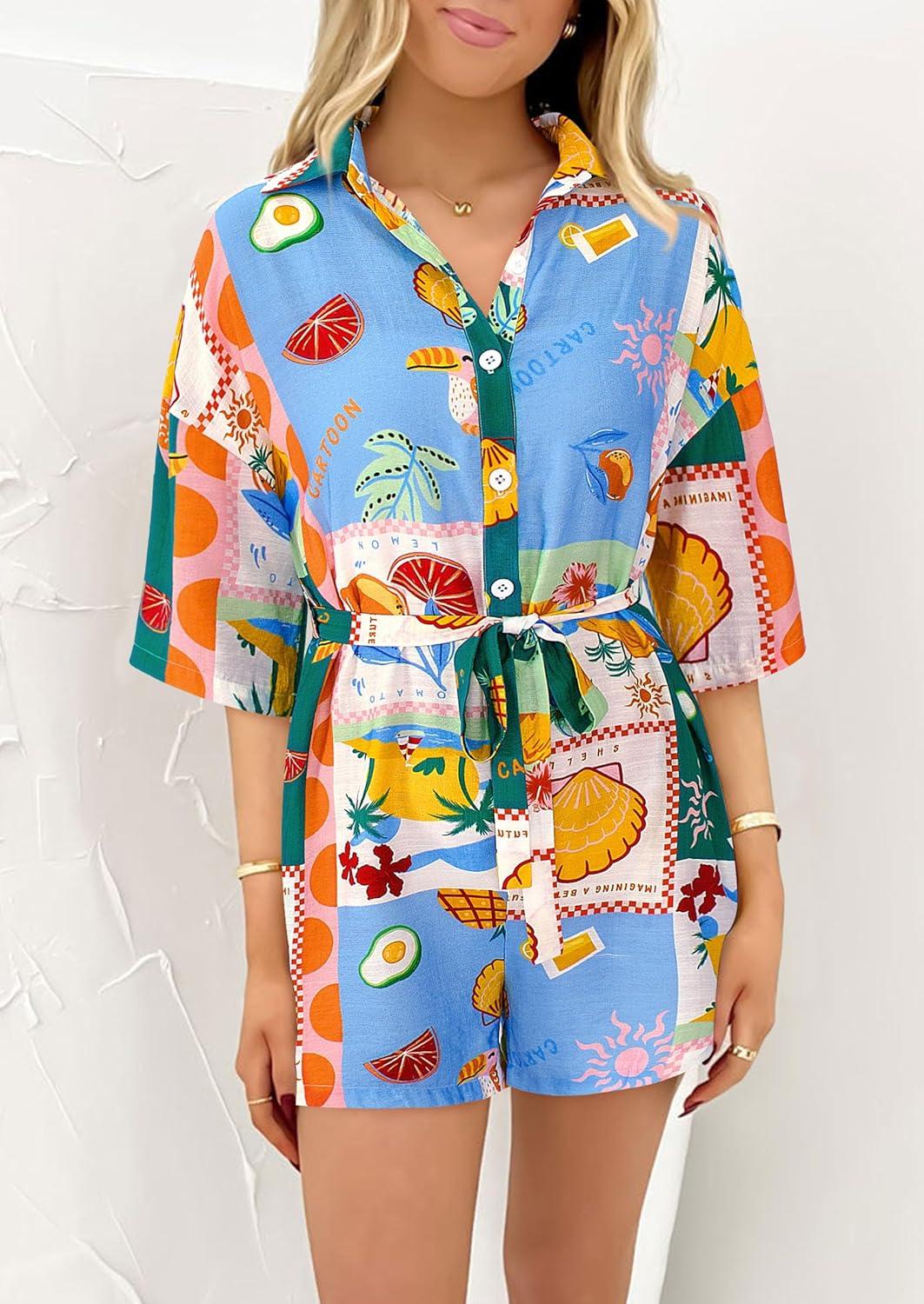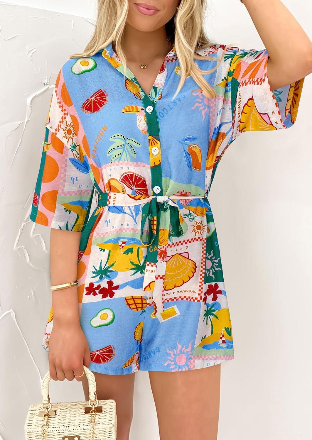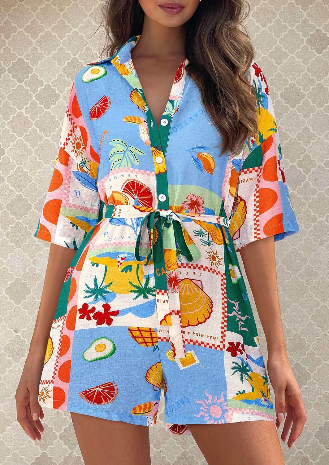 imagePRETTYGARDEN Womens Rompers for Summer 2025 Beach Vacation Clothes Short Sleeves Floral Jumpsuits Beach Cover UpWhite Blue Green Flower