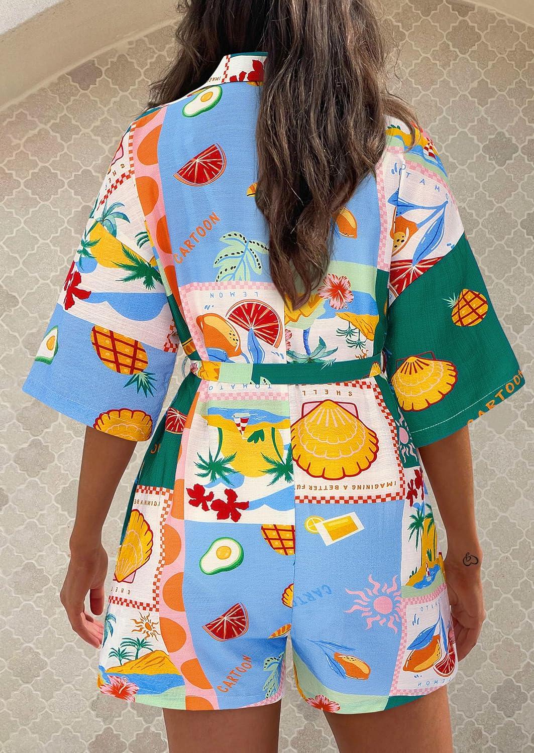 PRETTYGARDEN Womens Rompers for Summer 2025 Beach Vacation Clothes Short Sleeves Floral Jumpsuits Beach Cover Up(White Blue Green Flower)