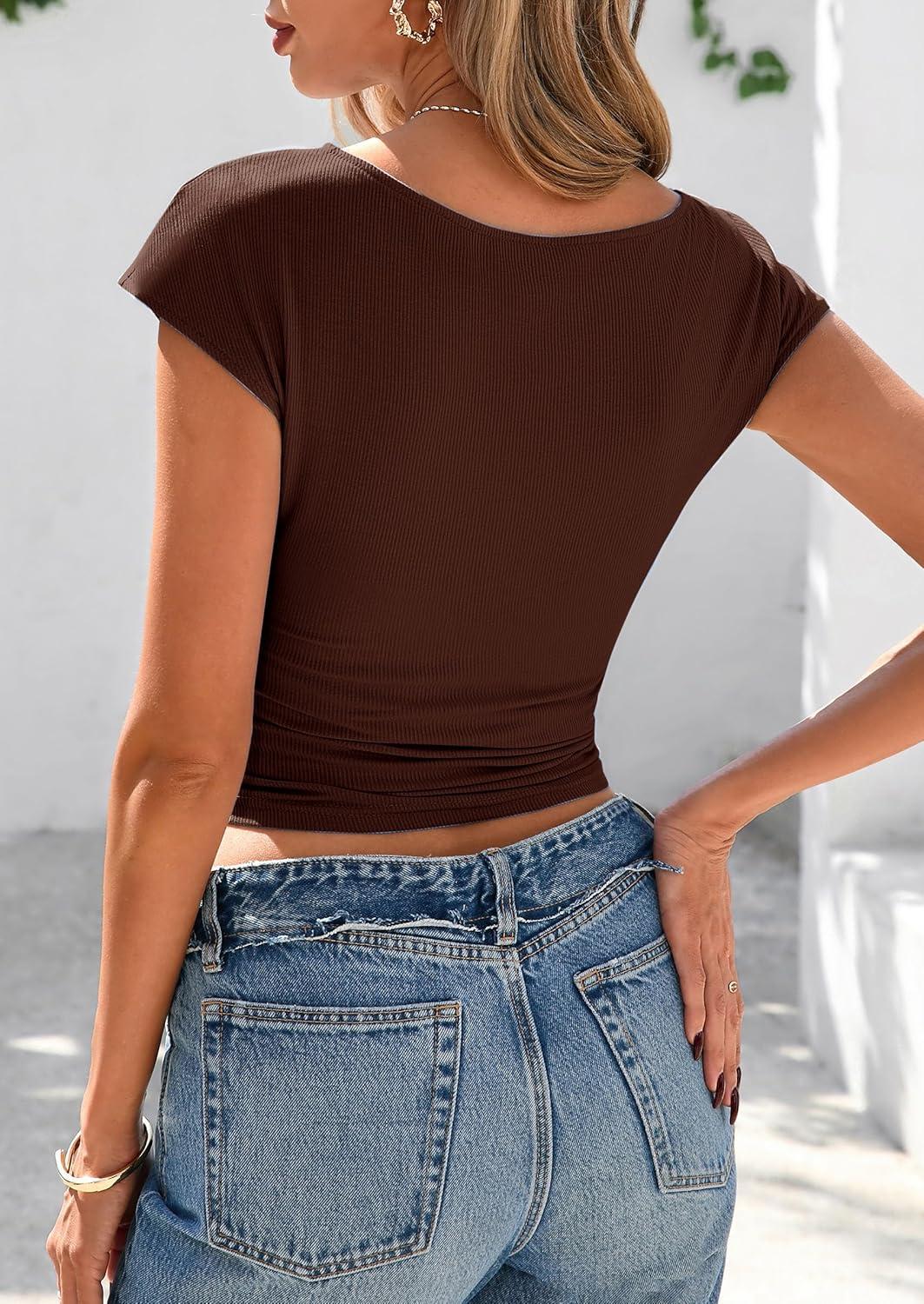 PRETTYGARDEN Women's Ruched Crop Tank Tops 2025 Summer Trendy Cap Sleeve Ribbed Knit Basic Fitted Going Out Tee Shirts(Coffee)