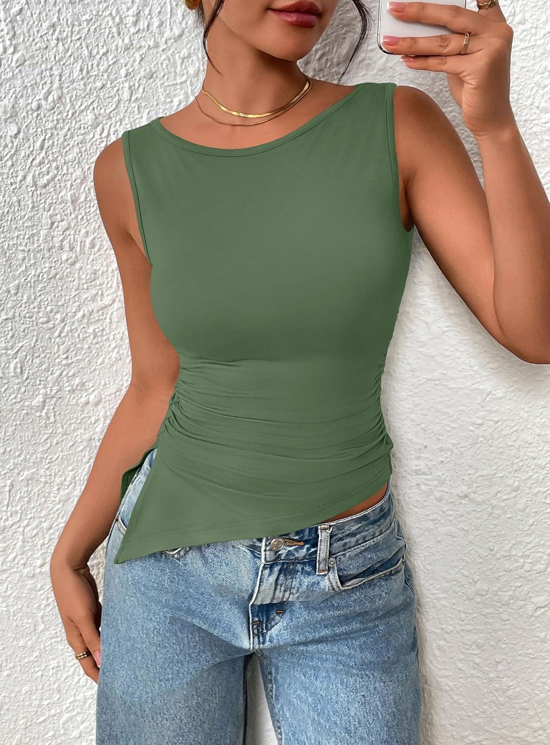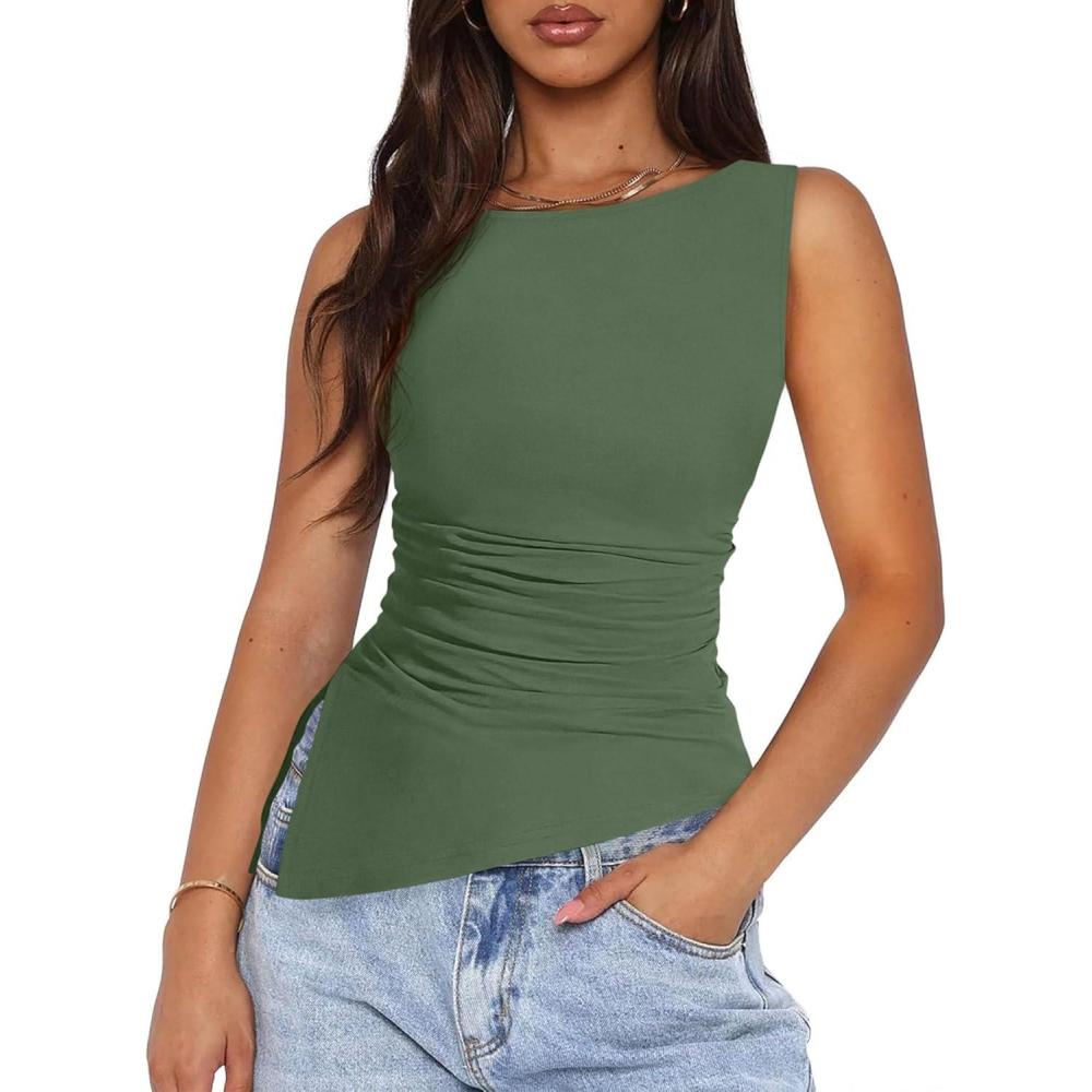 PRETTYGARDEN Womens Ruched Tank Tops 2026 Summer Sleeveless Slim Fit T Shirts Blouses Going Out Y2K Fashion Clothes(Sage Green)