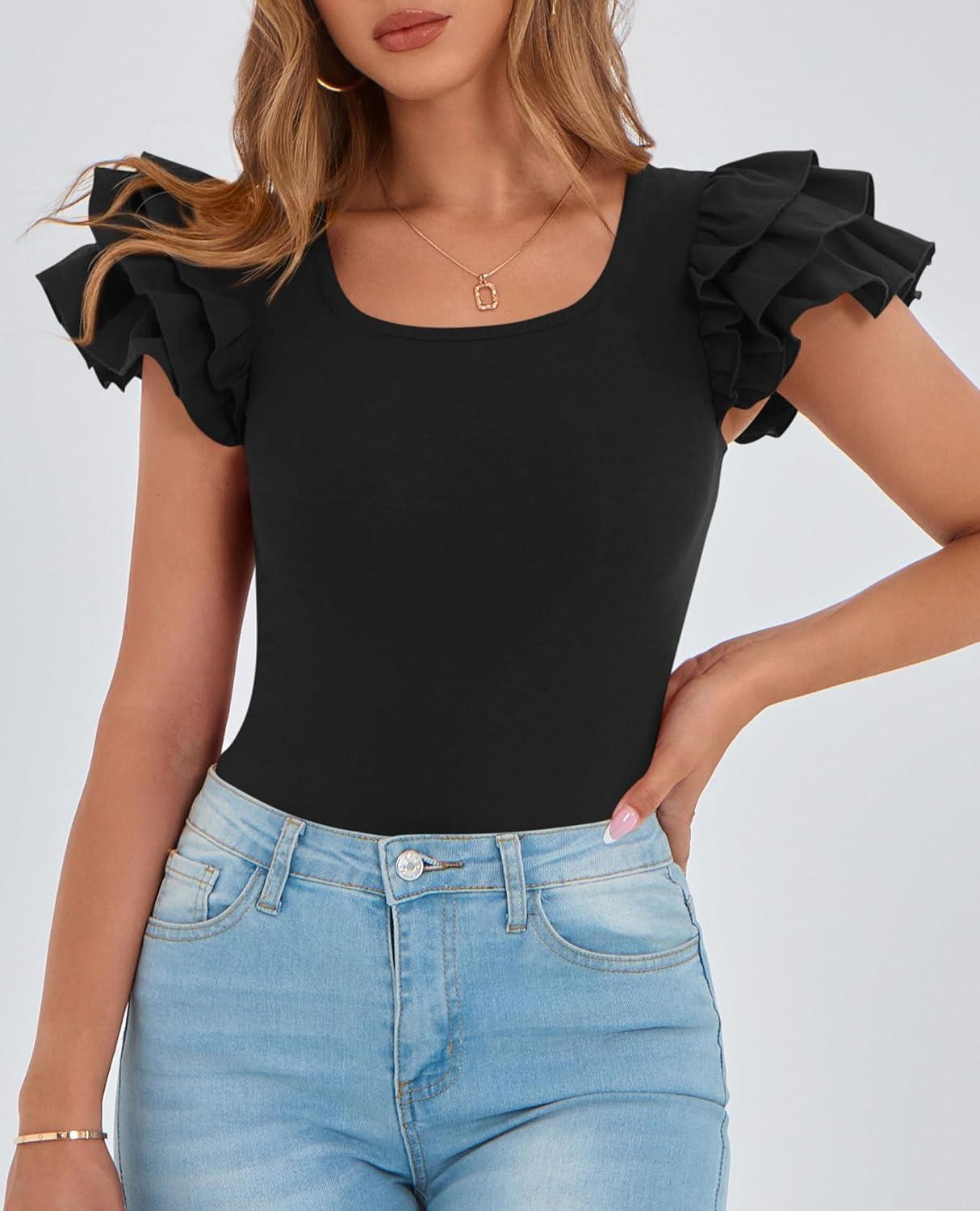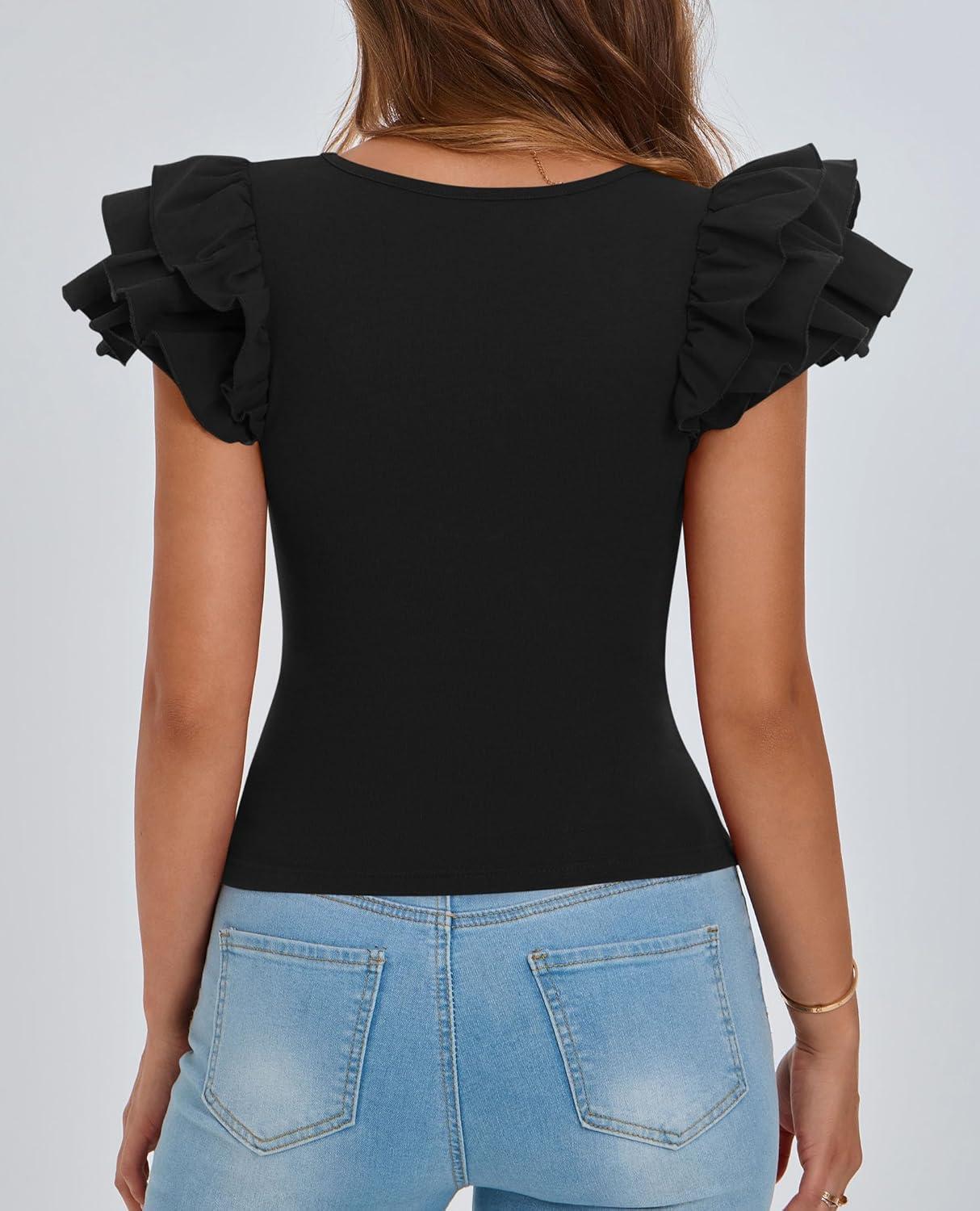 PRETTYGARDEN Women's Ruffle Short Sleeve Shirts 2025 Summer Casual Basic Tee Cute Fitted Crew Neck Fashion Tops Clothes(Black)